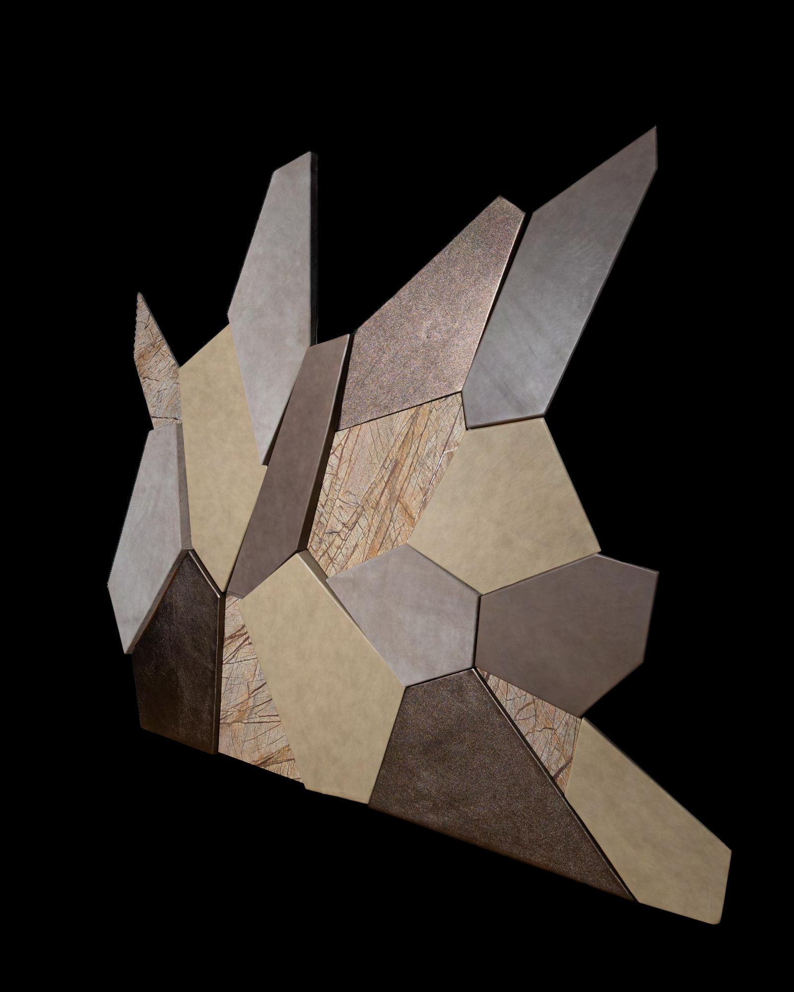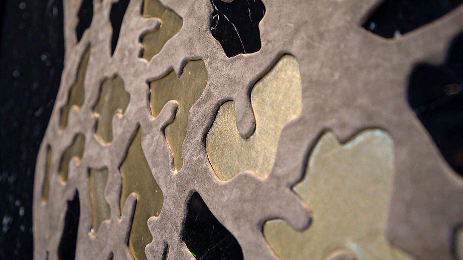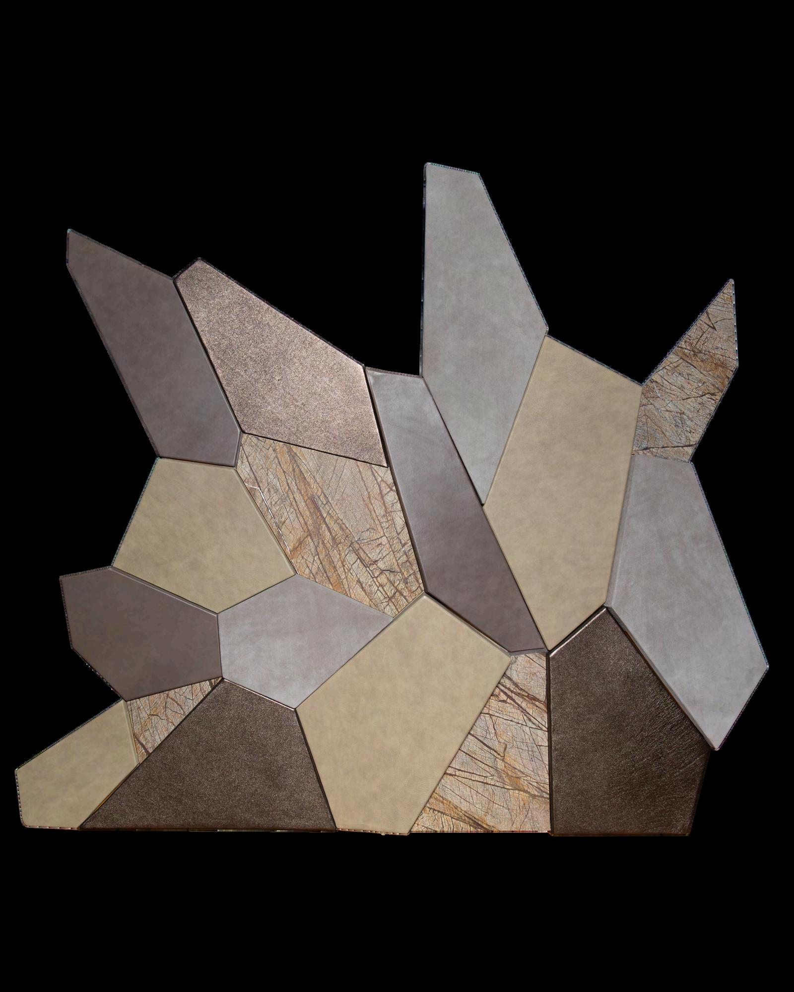 Theinsertionofbrushed-finishForestBrownmarbleelementsaddsanother level of material complexity to the work: the matte texture of brushed marble creates a fascinating contrast with the variety of leather finishes, whileitsnaturalcolorationfurtheranchorstheconceptofearthlyelements inthecomposition.