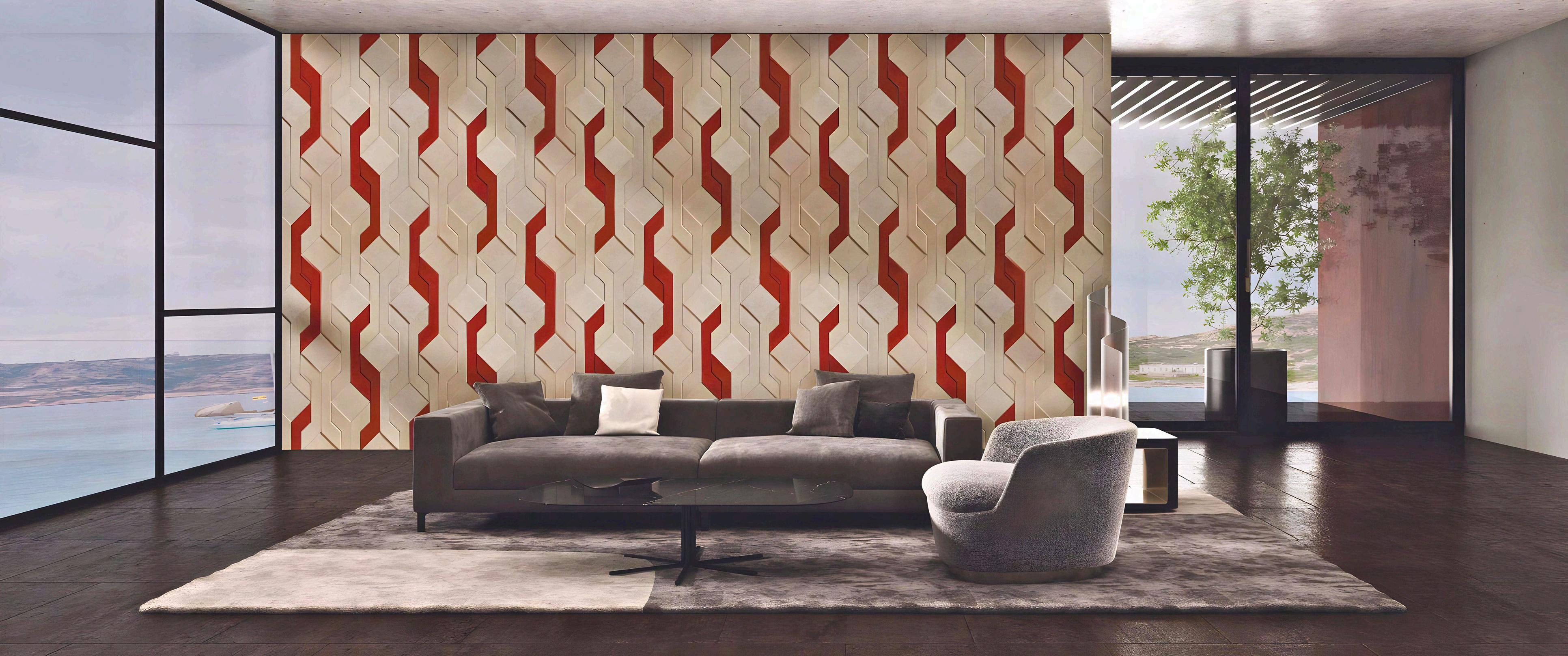 This fascinating language is ideal for the decoration of surfaces that ask to be transformed into sculptural objects, such as important doors or entrances, ceiling lights, bed headboards, boiseries, decorative panels with sound-absorbingpropertiesandevenfurnishingobjects.