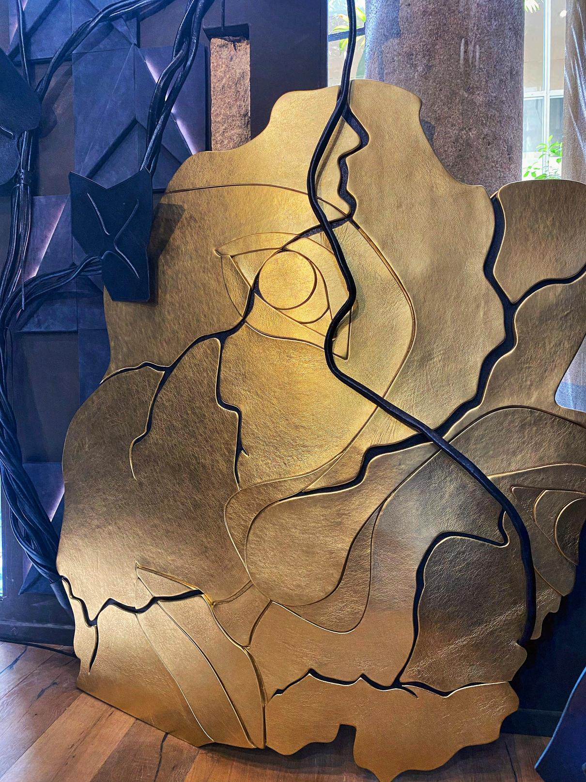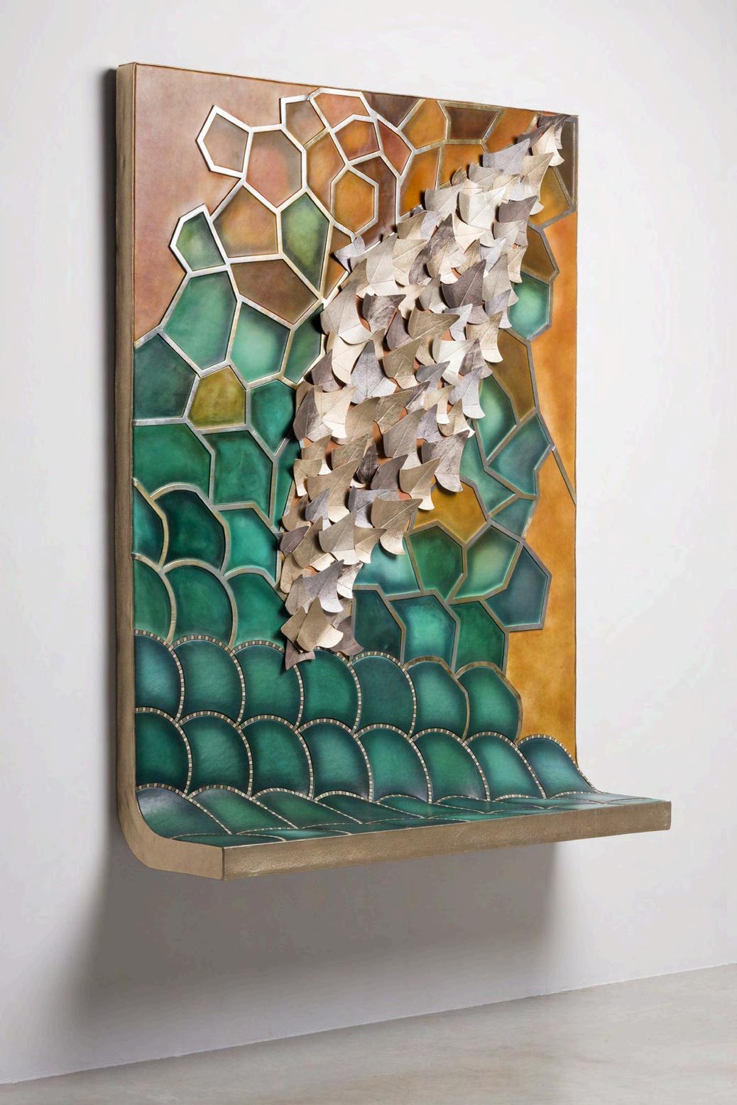 nspired by Villa Mozart, an example of 1930s Art Deco architectural elegance, "Mural Perch" pays homage to the fusion between natural beauty and Milanese architectural elegance and arabesque fantasies. The work features wood inlays and laminated leather sculptures on hand-painted calfskinbase,withhigh-reliefdetailslaminatedwith goldandsilverleaf.