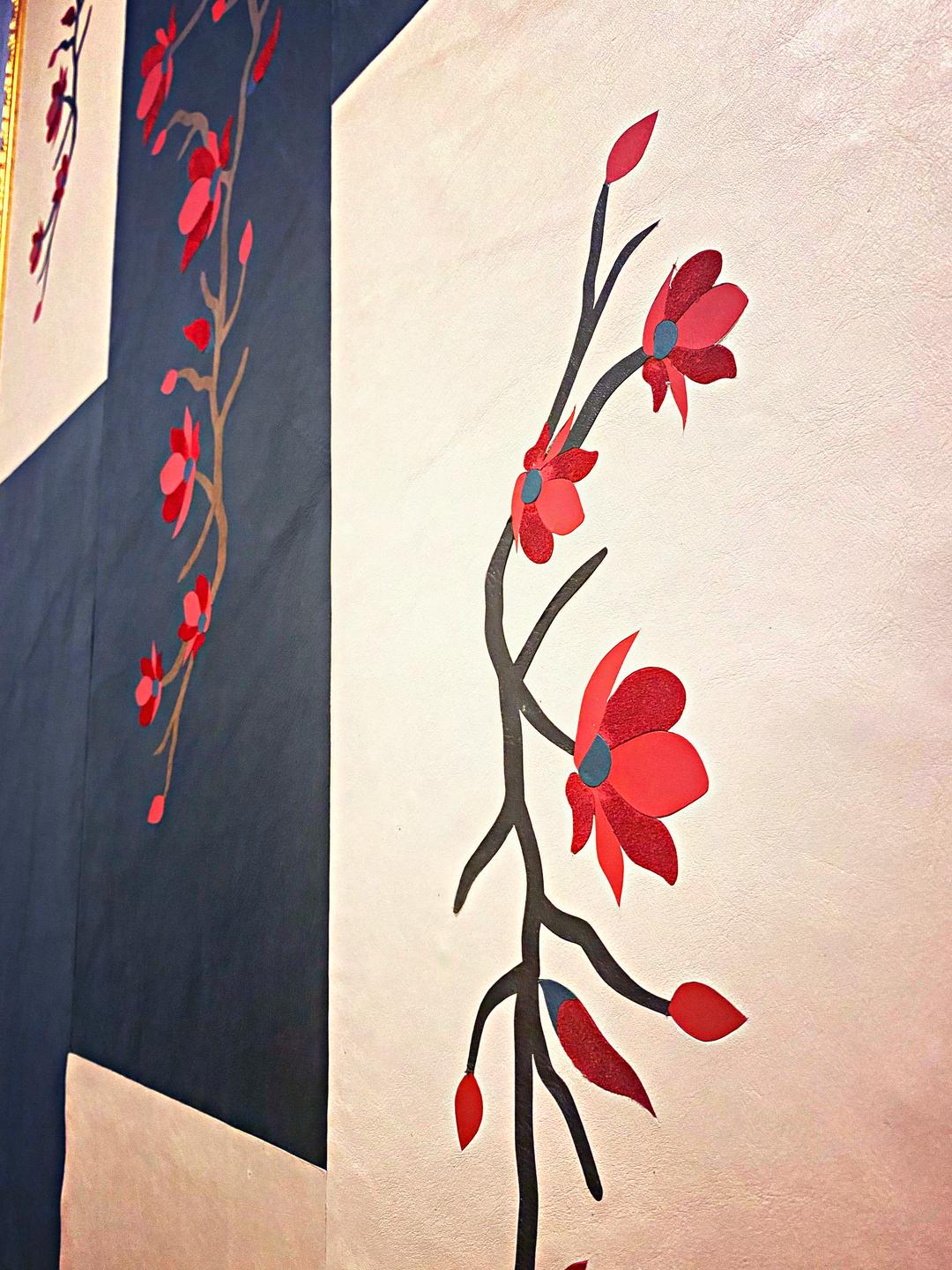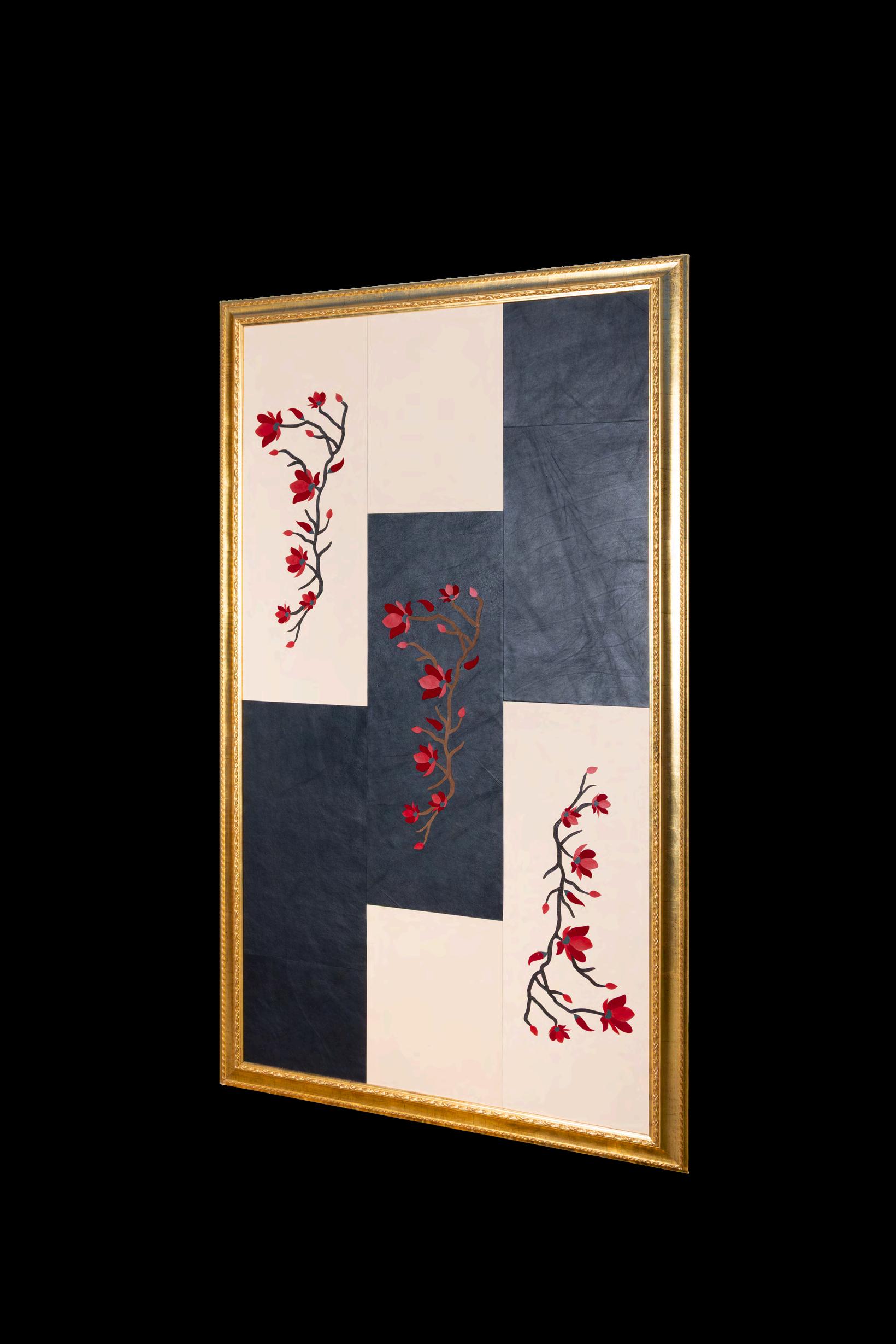 Thepanelrepresentsanextraordinarycelebrationofthedelicatebeautyof cherry blossoms, a symbol of rebirth and transience in Oriental culture, reinterpretedthroughthemasteryofItalianleatherwork.