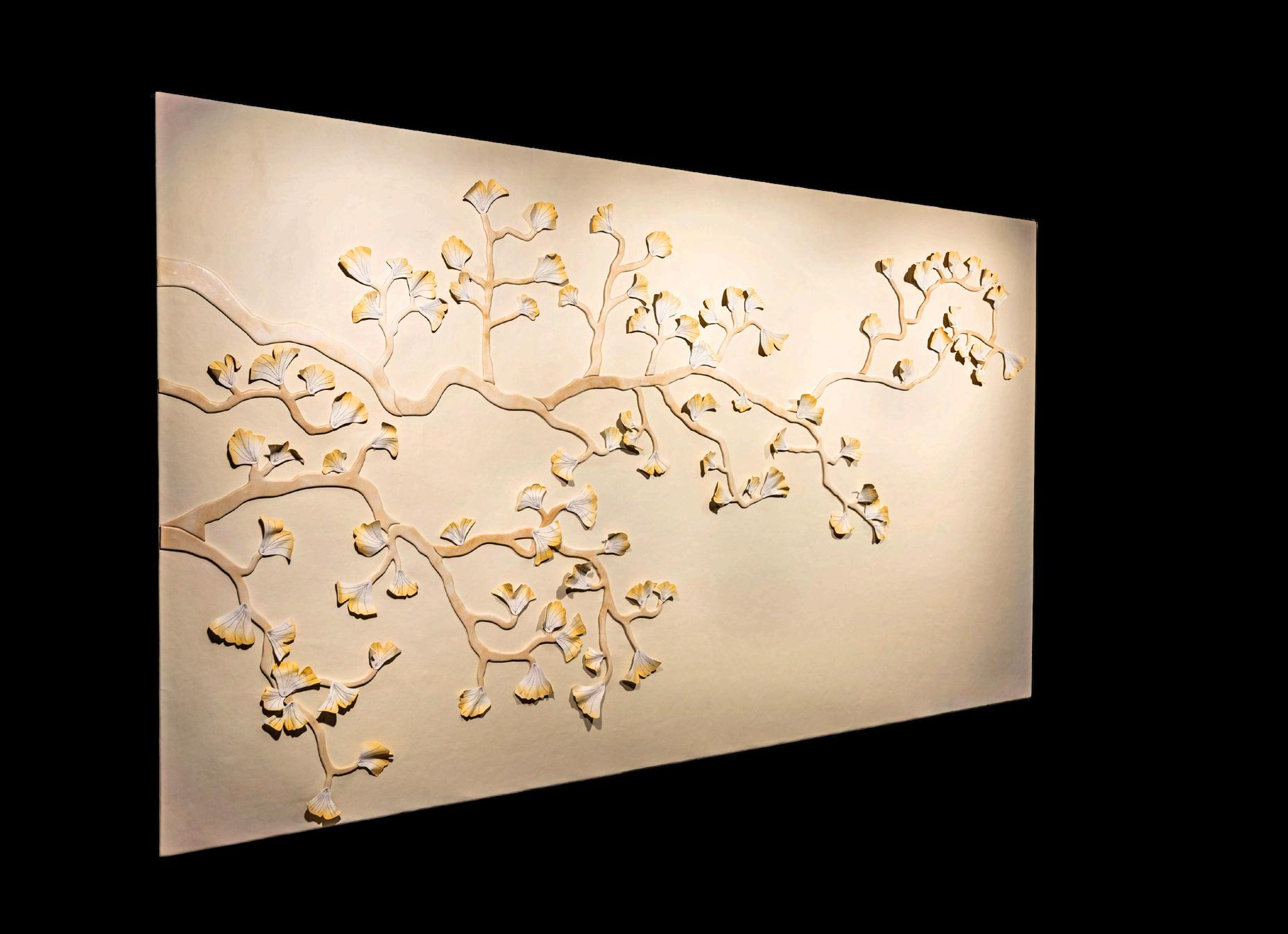 The work depicts a ginkgo branch, a millennial tree laden with symbolic meanings in Eastern cultures, interpreted here through a hand-crafted high relief technique that transforms the material into a true three-dimensional sculpture.