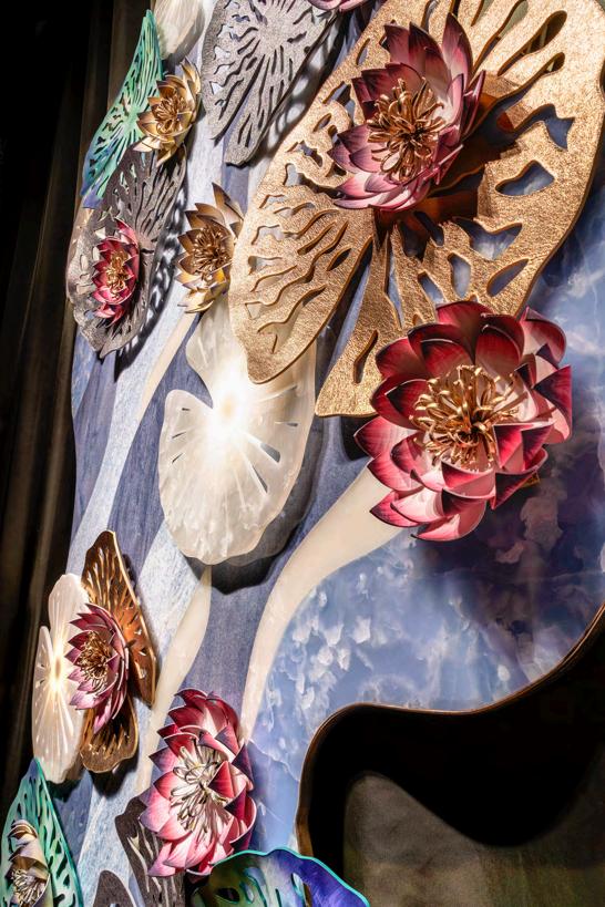 The leaves, crafted in gold and silver laminated calfskin, as well as in hand-shaded crust leather, confer sophisticated elegance. Artisanal virtuosity finds its highest expression in the sculptural modeling of lotus flowers, also hand-dyed. Each color, each shade, is an essence captured from Monet's palette. The lighting animates the water imaginedbyMonetwithplaysofreflections.