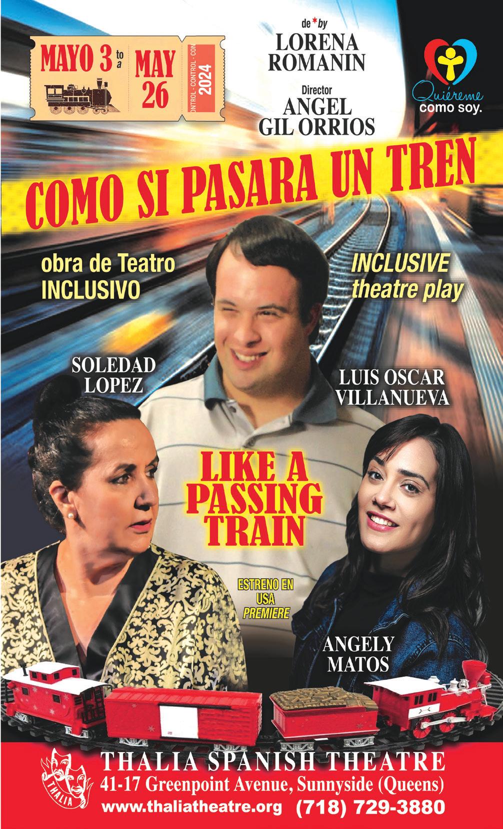 Thalia Spanish Theatre presenta el estreno en Estados Unidos de la obra Como si pasar un tren. Protagonizada por Soledad López, Luis Oscar Villanueva y Angely Matos. Una producción de teatro inclusivo de Lorena Romanin, producida, diseñada y dirigida por Angel Gil Orrios