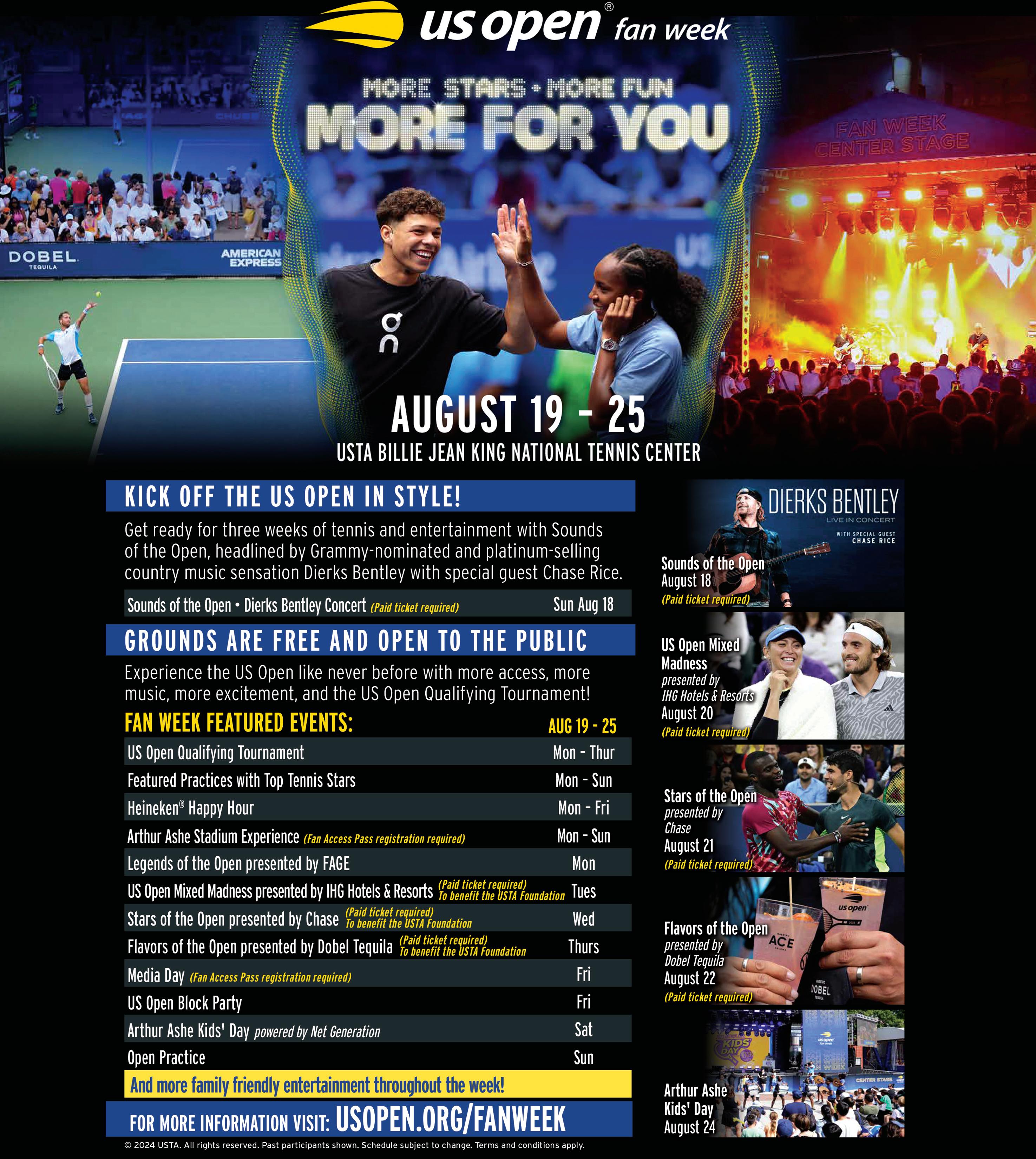 Domingo 18 de agosto: concierto Sounds of the Open (Sonidos del Open) con la super estrella de la música country Dierks Bentley, acompañado por Chase Rice, figura también en el gremio country. Estadio Louis Armstrong, 7:30 p.m.