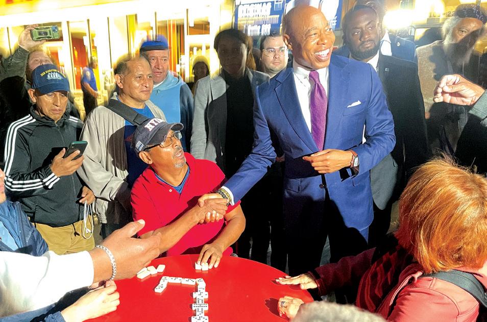 Lo primero que hizo fue saludar a un grupo de latinos que jugaba dominó a oscuras en Corona Plaza, Queens. Estrechó sus manos y se tomó fotos con la misma sonrisa que lo caracteriza.
