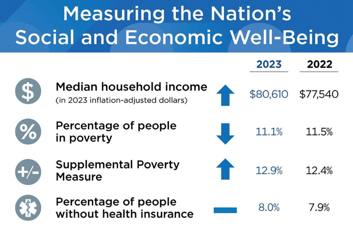 La Oficina del Censo de los EE. UU. anunció que la mediana real de ingresos de hogares aumentó el 4.0 % entre el 2022 y el 2023. La tasa oficial de pobreza disminuyó 0.4 puntos porcentuales y llegó al 11.1 %. La tasa de medición suplementaria de la pobreza (SPM) en el 2023 fue del 12.9 %, lo cual representa un aumento de 0.5 puntos porcentuales en comparación con la del 2022.