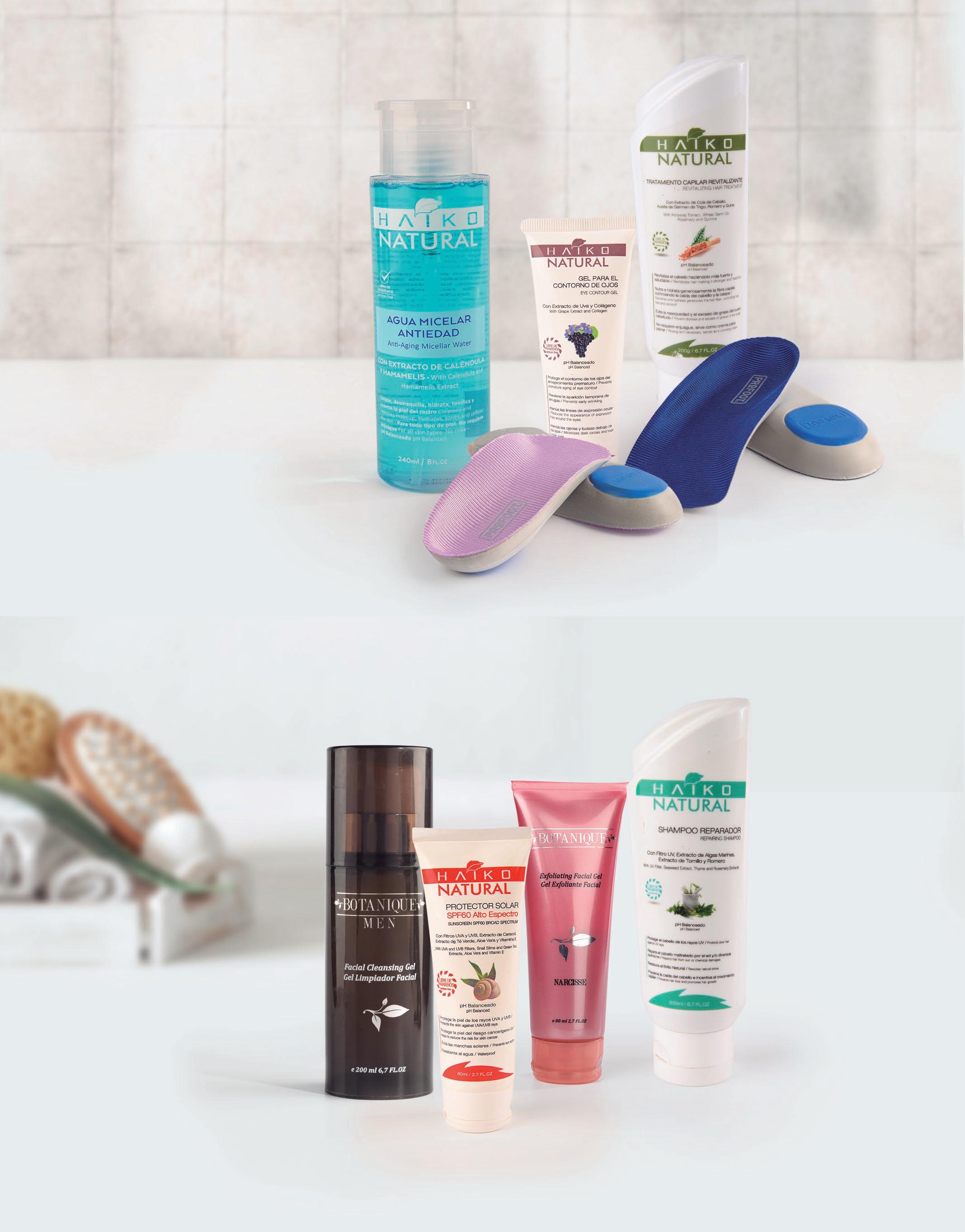 solar SPF 60 Cód. 149001, Gel exfoliante Cód. 151003, Shampoo