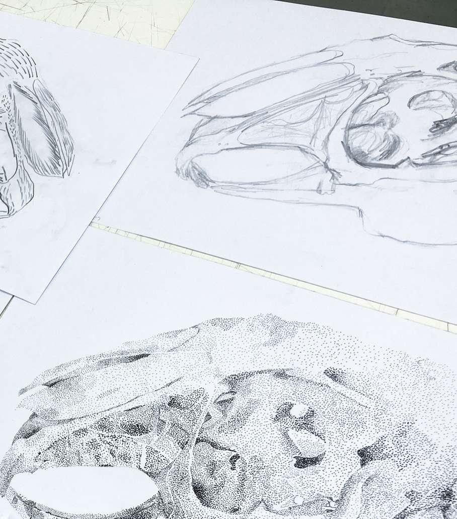 - Aparte, se les realizó el encargo de trabajar en una obra a mayor escala (medio pliego y pliego entero) donde ambas técnicas vistas (grabado y traspaso) aparecieran en la composición, pudiendo adicionar también, técnicas más libres como intervenciones con spray, stencil, pintura, lápices, collage, etc.