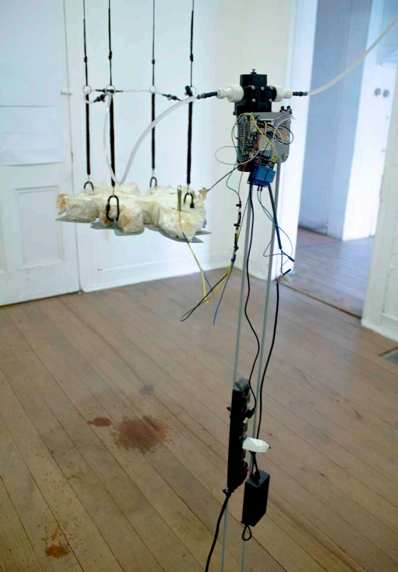 En el centro de la galería pende un objeto «micelístico», como le llama Juanita. se trata de un soporte metálico cuya forma, sostenida por un tipo de arnés, porta una colonia de hongos ostra que meticulosamente preparó para la ocasión. la vida de estos organismos, en la misma sala, depende de un sistema sensible a la humedad que, vía arduino, le suministra el rocío necesario para que subsistan. lo bello de este suave regadío, es que atomiza agua de lagrimaterapia que juanita recolectó entre su familia. resulta fantástico afirmar que la obra, en sentido estricto, se autorregula; y que, para ello, necesita indirectamente a los cuerpos de juanita y sus seres queridos vía lágrimas, quienes a su vez cierran este círculo comiendo los mismos hongos, dejando todo extraña y profundamente enlazado.