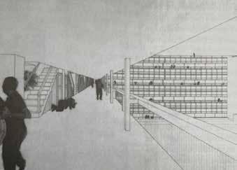 het maaiveld. De maaivelden zijn aan elkaar verbonden met een route, welke is ontworpen aan de hand van mijn persoonlijke bergmomenten. De ontworpen route fungeert als verlengstuk van de straat op het maaiveld en eindigt boven op het gebouw. Door het slim kiezen van ondersteunende functies en het nauwkeurig positioneren hiervan ontstaan er vele looplijnen. Daarnaast zijn de maaivelden en is de route met veel aandacht ontworpen, waardoor een verticale en dynamische woonomgeving is ontstaan.