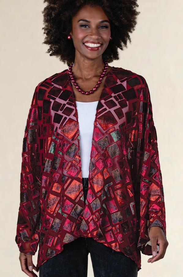 New Rich ruby red, 100% hand-loomed silk. Features black rectangular buttons, full length sleeves, flared hem. Dry clean only. Available in S 6-8, M 8-10, L 10-12, XL 12-14. R5T04-020 $159
