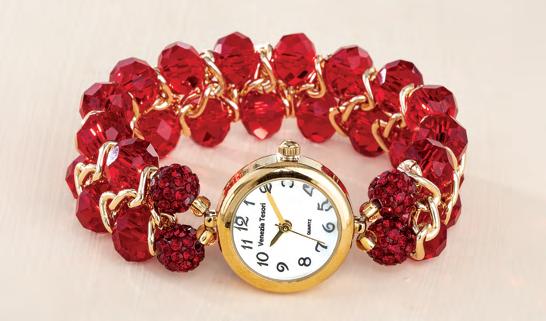 New Faceted Murano glass berry red beads mixed with gold-plated chain. 1" dia. quartz face. Stretches to fit most wrists. R5T02-030 $138