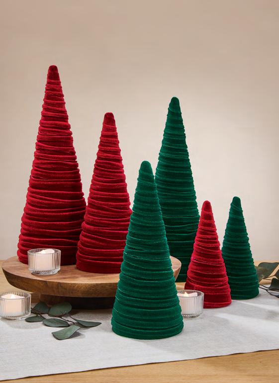 New Hand-cut, hand-wrapped and hand-sewn velvet cone trees. Set of three. Small, approx. 7" tall. Medium, approx. 10" tall. Large, approx. 13" tall. $60/set