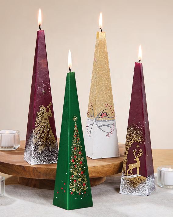Handcrafted with paraffin and a cotton wick. Hand-painted with seasonal designs. Unscented. Each 10" tall. $40/ea.