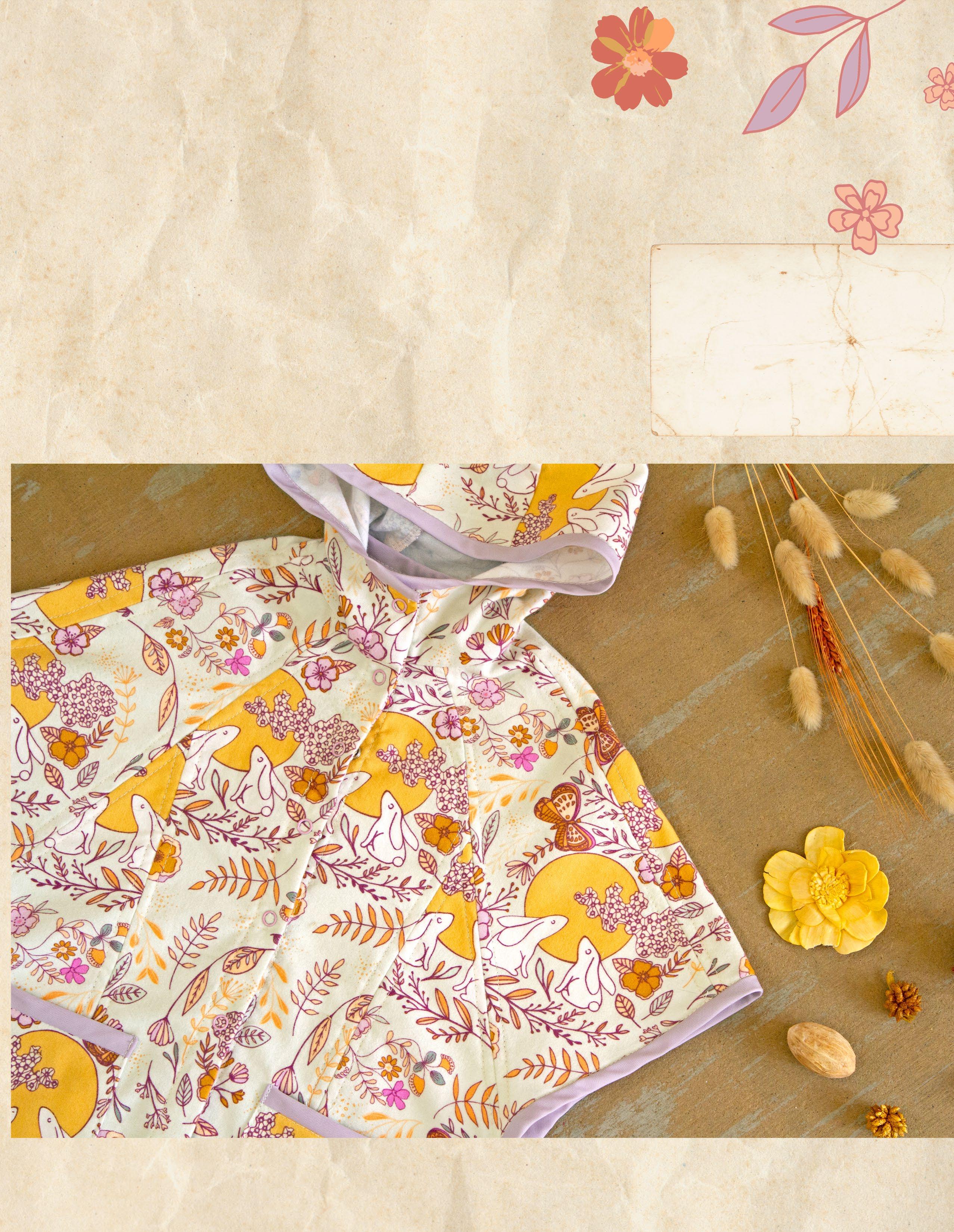 For those cool days of winter, a poncho is a great garment to make for your little one. Maureen Cracknell’s collection Crafting Magic includes straight out of a fairy tale prints ideal for any kid. For this project we used Moon Stories Five in Flannel, featuring adorable bunnies and pastel flowers that will make little ones never want to take this poncho off!
