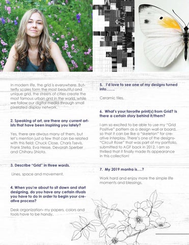 5. I’d love to see one of my designs turned into……. Ceramic tiles. 6. What’s your favorite print(s) from Grid? Is there a certain story behind it/them? I am so excited to be able to use my “Grid Positive” pattern as a design wall or board, so that it can be like a “skeleton” for creative interplay. There’s one of the designs“Circuit Rose” that was part of my portfolio, submitted to AGF back in 2012. I am so thrilled that it finally made its appearance in this collection! 7. My 2019 mantra is….? Work hard and enjoy more the simple life moments and blessings.