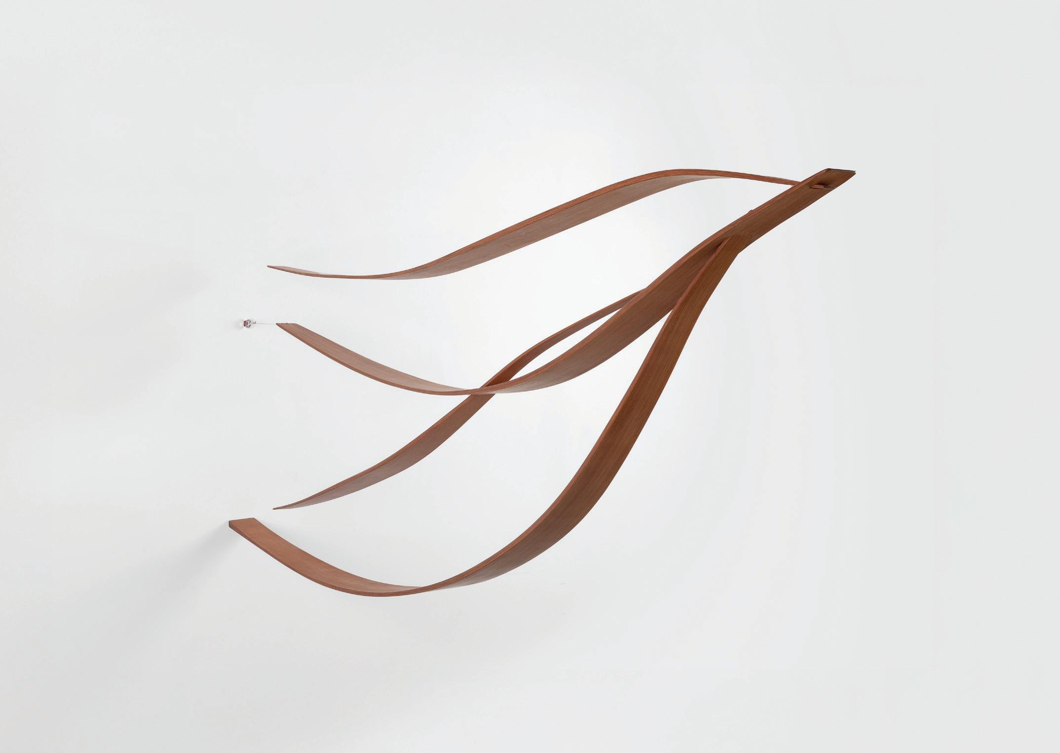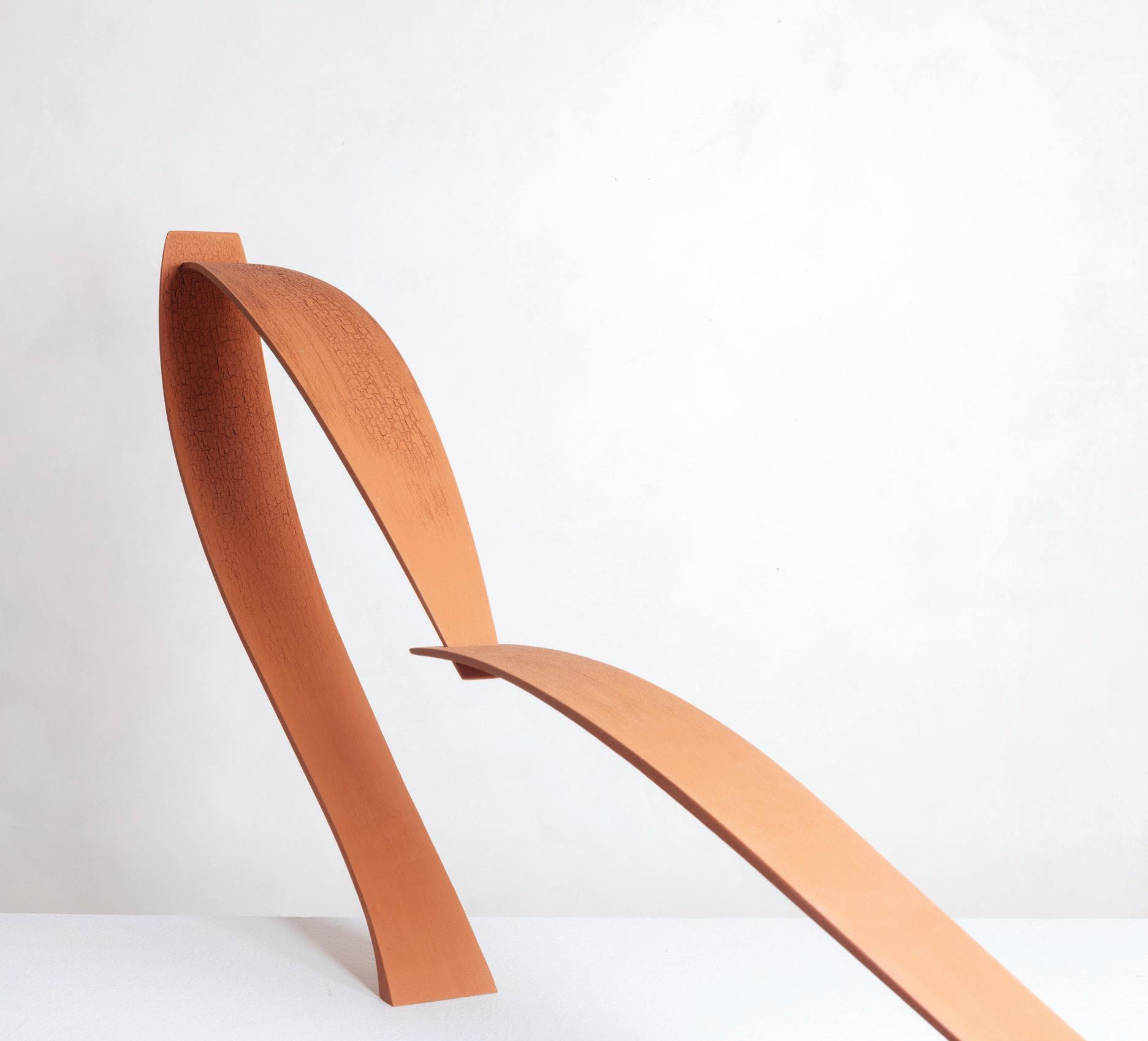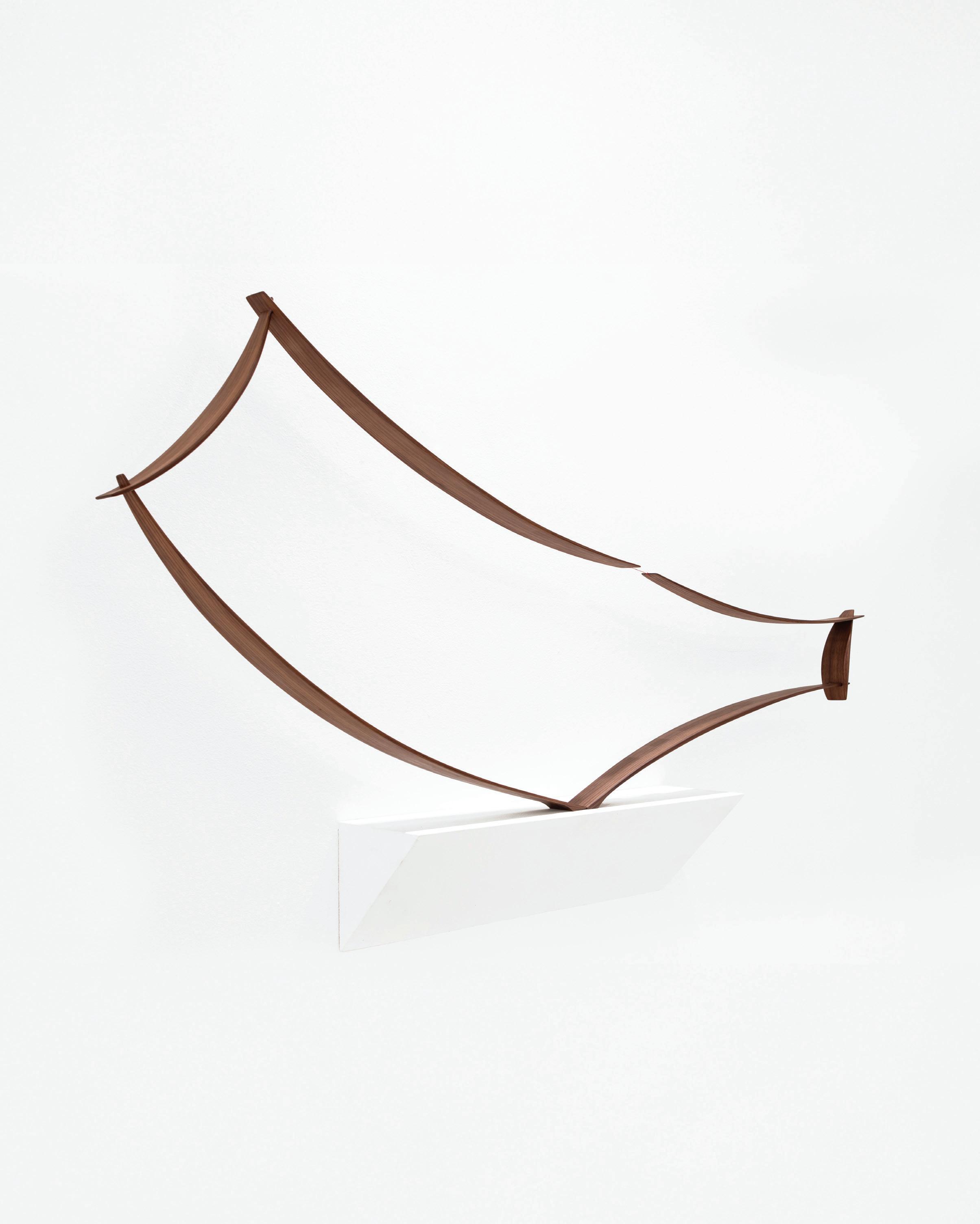 The bedrock of Clift’s practice are cantilevered forms, balanced on a small foot and standing in isolation. Using a bandsaw, he cuts long, curved sections out of solid wood, and connects the pieces by inserting one into the other via chiselled slits. Clift’s sculptures rely on the interplay between gravity, balance and equilibrium, and in doing so, make tangible the tension between vulnerability and resilience. In order to increase a sculpture’s strength, he sometimes laminates thin strips of wood around layers of carbon fiber. Although the viewer feels their precariousness, the structures stand independently, without fixtures or fittings.