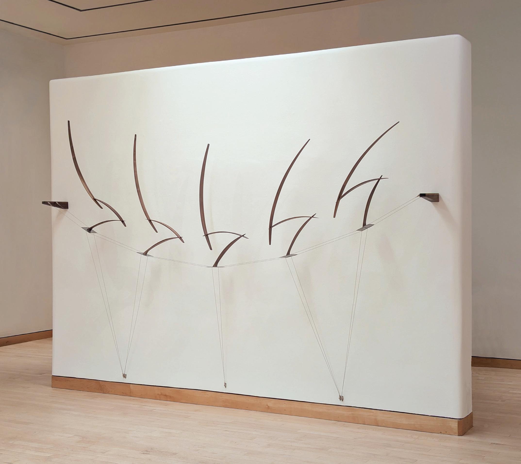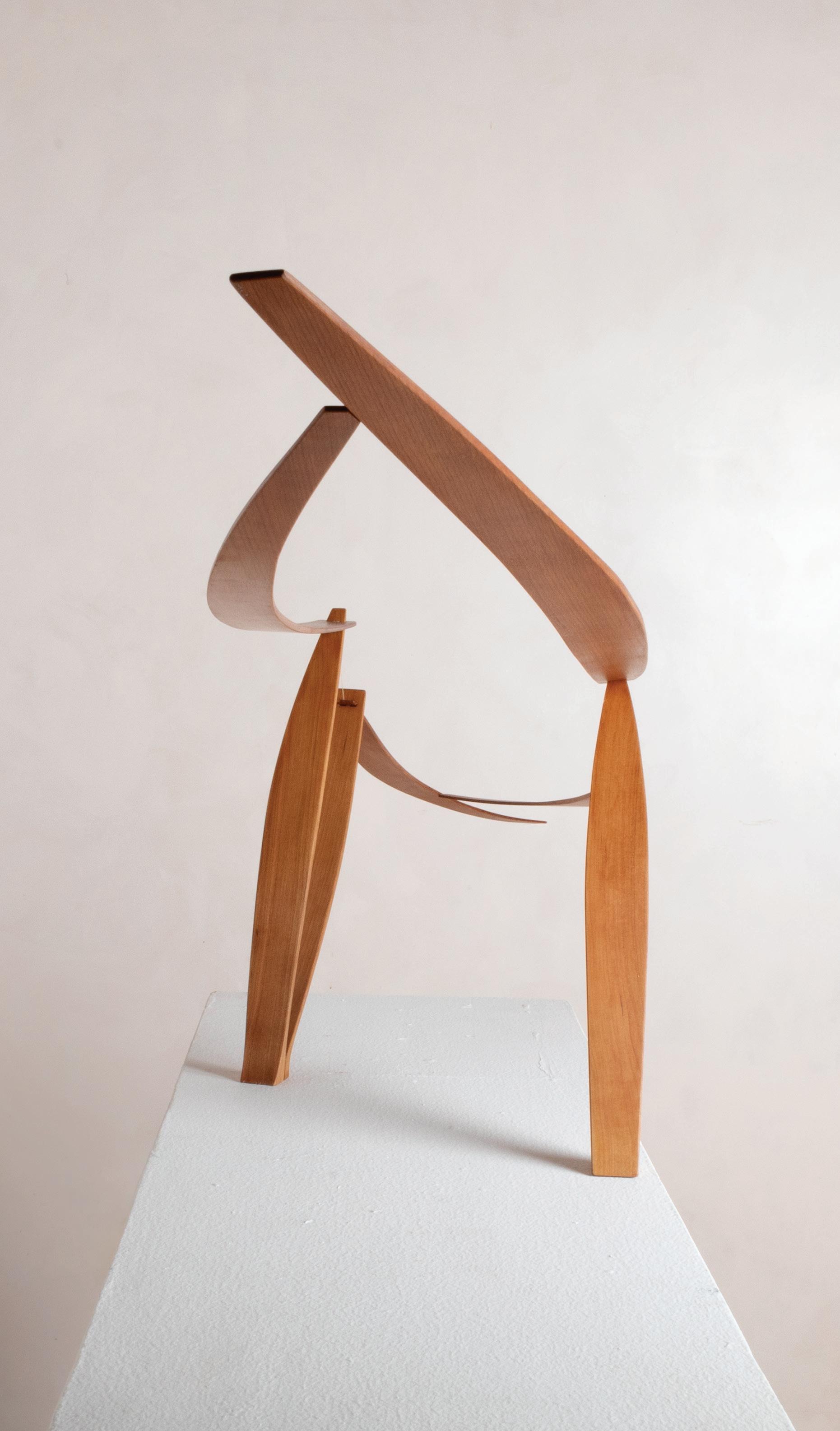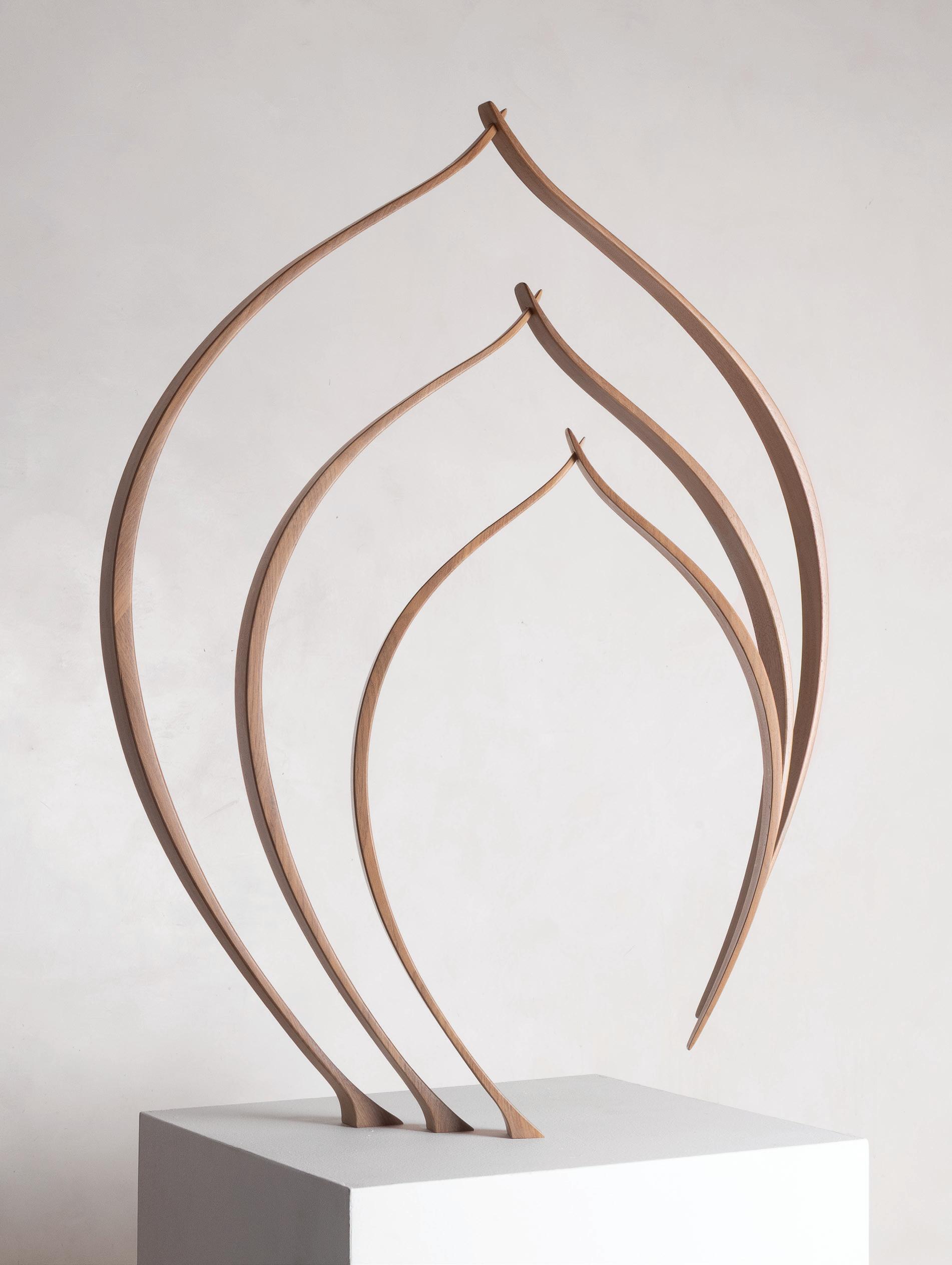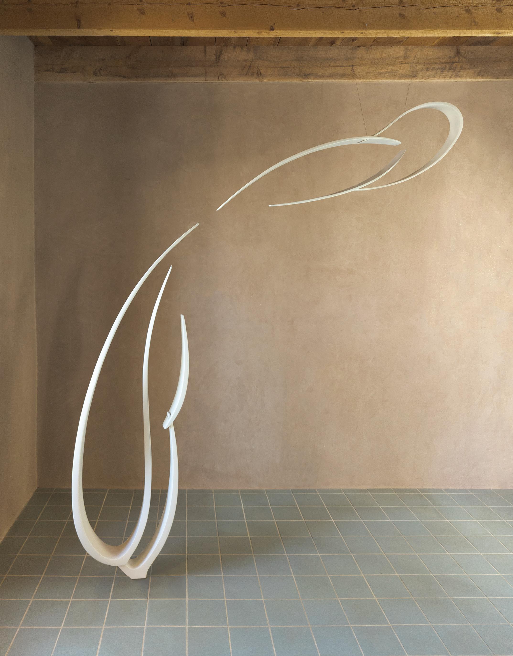 As Clift’s practice continues to evolve, large-scale site-specific projects require materials other than wood. For several works in the exhibition, he uses a core of rigid foam with steel to reinforce the sculpture’s joints, and then wraps this in a carbon fiber composite exoskeleton. Convergence, his largest carbon fiber work at around 18-feet tall and 16-feet wide, was commissioned for the City Hall in Mesa, Arizona, in 2024, while the maquette is included in the exhibition. In Convergence, two conciliatory forms – one standing, the other suspended – denote a coming together of government and the public. Murmuration, a response to a gust of wind animating a tree in the Chậteau’s gardens, pushes the limits of what sculpture can be, in that sweeping arcs slice the air, as if by their own volition.