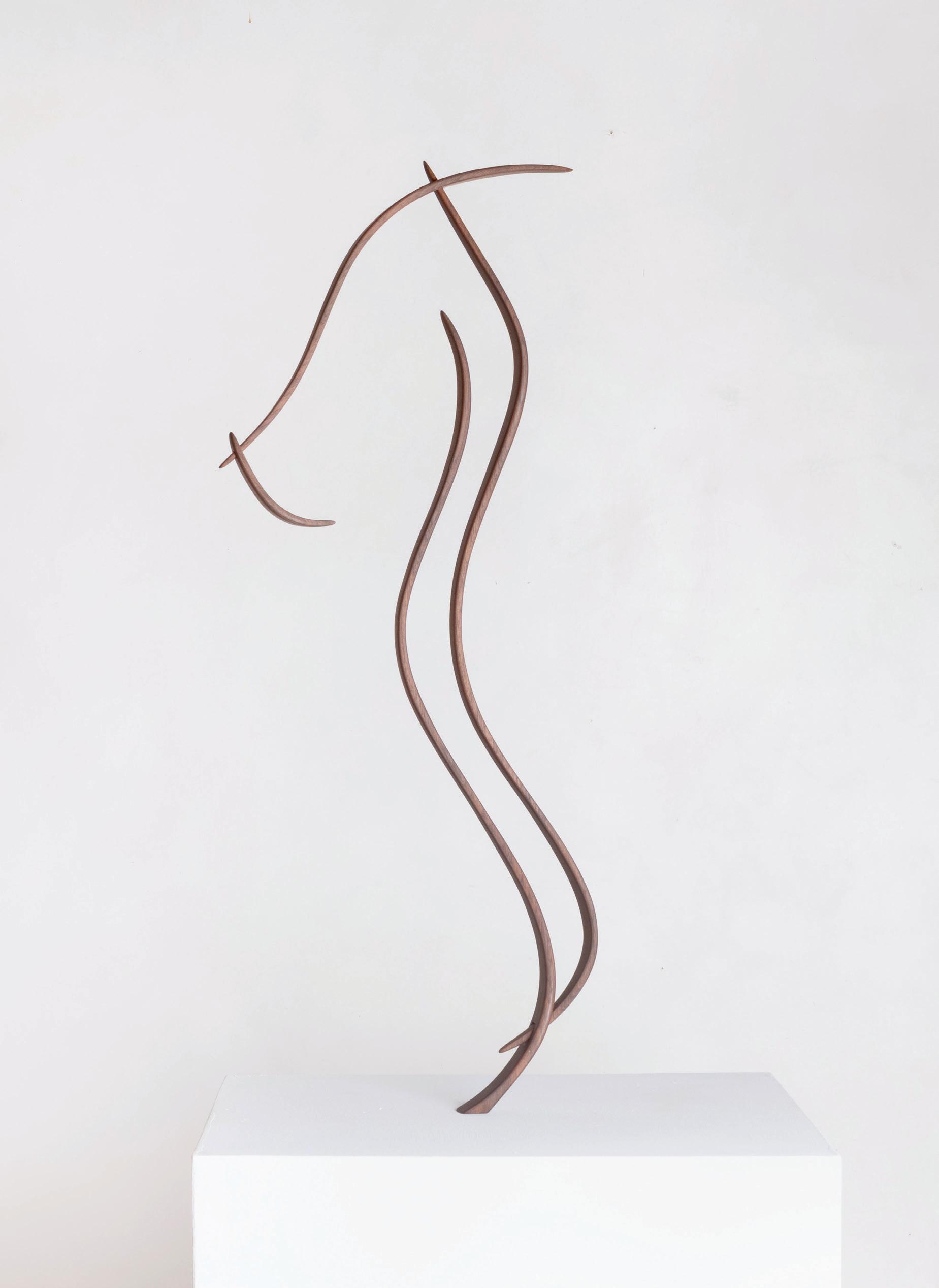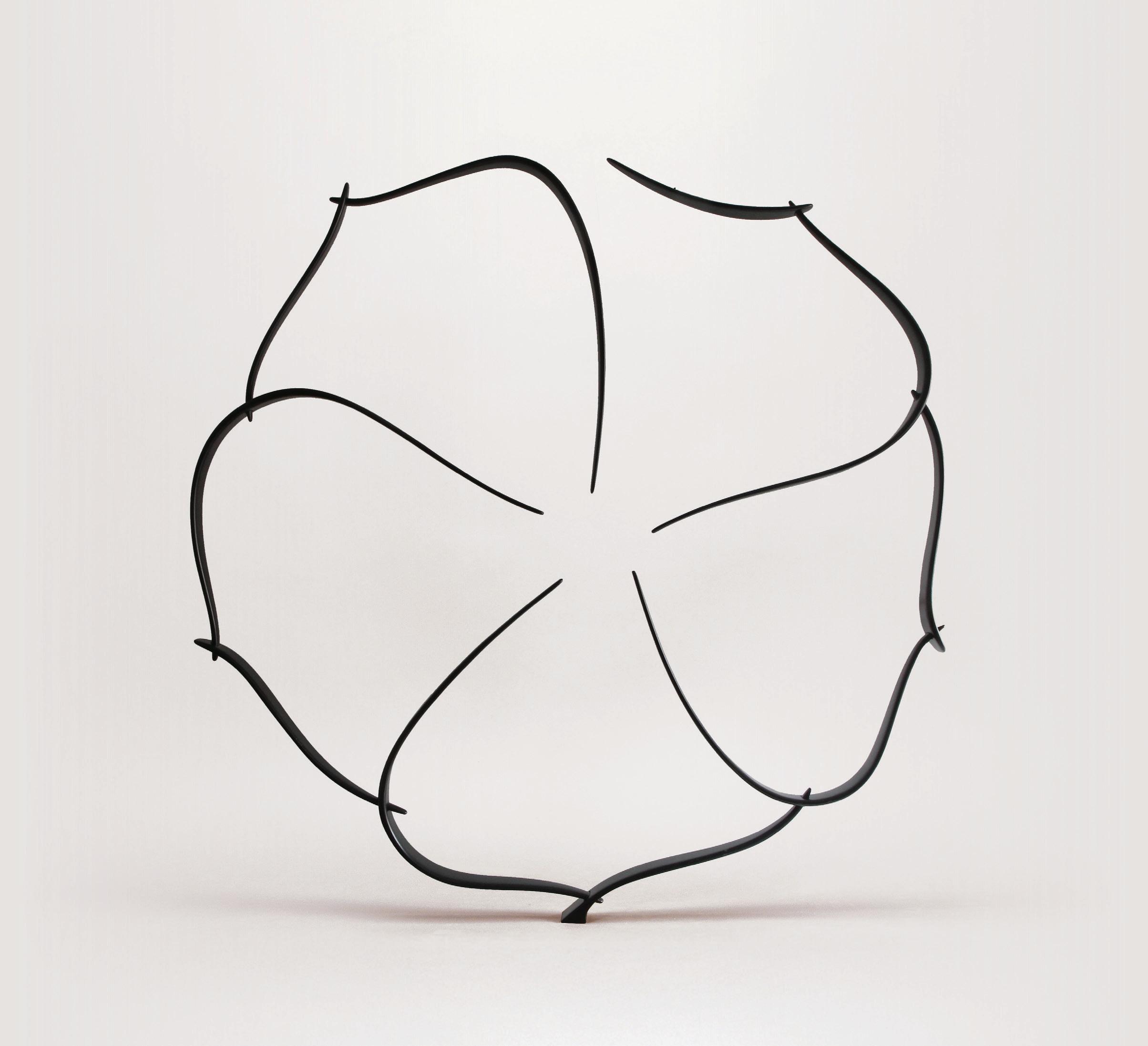 Clift’s practice has now evolved to explore mutually reliant groupings, such as Centripetal, Centrifugal and Forms on a Catenary Curve. Both gain their resilience through connection, not isolation. In Forms on a Catenary Curve, two parallel cables held at either end curve down to the middle, with five forms balanced like acrobats on a high wire. All possess the same three elements and points of connection, but an angle changes in each to shift the overall weight and gravity of the piece, allowing it to adapt to the different angles on which it stands to achieve equilibrium. In Centripetal, Centrifugal, five opposing forms seemingly gyrate, yet, while the individual pieces are out of equilibrium, as a group they remain upright. The theme of mutual reliance is intrinsic to Nested, a smaller version of a 10-foot tall steel sculpture, commissioned for Baptist MD Anderson Cancer Center, Florida, in 2018. Nested symbolizes a relationship of care – a doctor and patient, or mother and child – while each form steps out in rotation away from the other, suggesting protection, but also a separation from the unit.