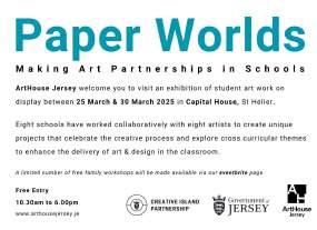 Eight artists were invited to deliver MAPS between October 2024 and Spring 2025 working collaboratively with eight local schools. In 2025 the exhibition, Paper Worlds, celebrated the work created by students in Jersey. Each artist brought with them a strong foundation in art & design and a commitment to their own creative practice which allowed them to share skills, knowledge and a passion for the visual arts in the classroom.