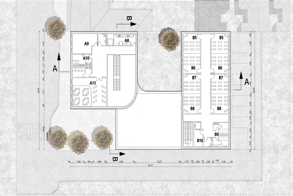 -The administrative wing, A, is oriented towards the street and it also acts a sound barrier to all the noise from the street as this is a busy street during particular hours of the day. It contains all the administrative needs and also some hybrid functions.