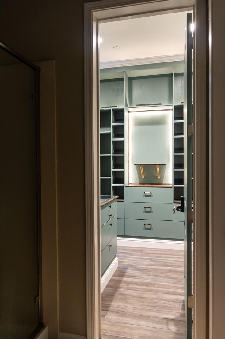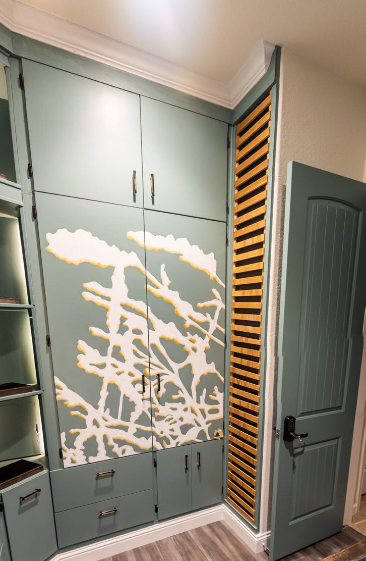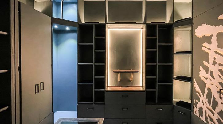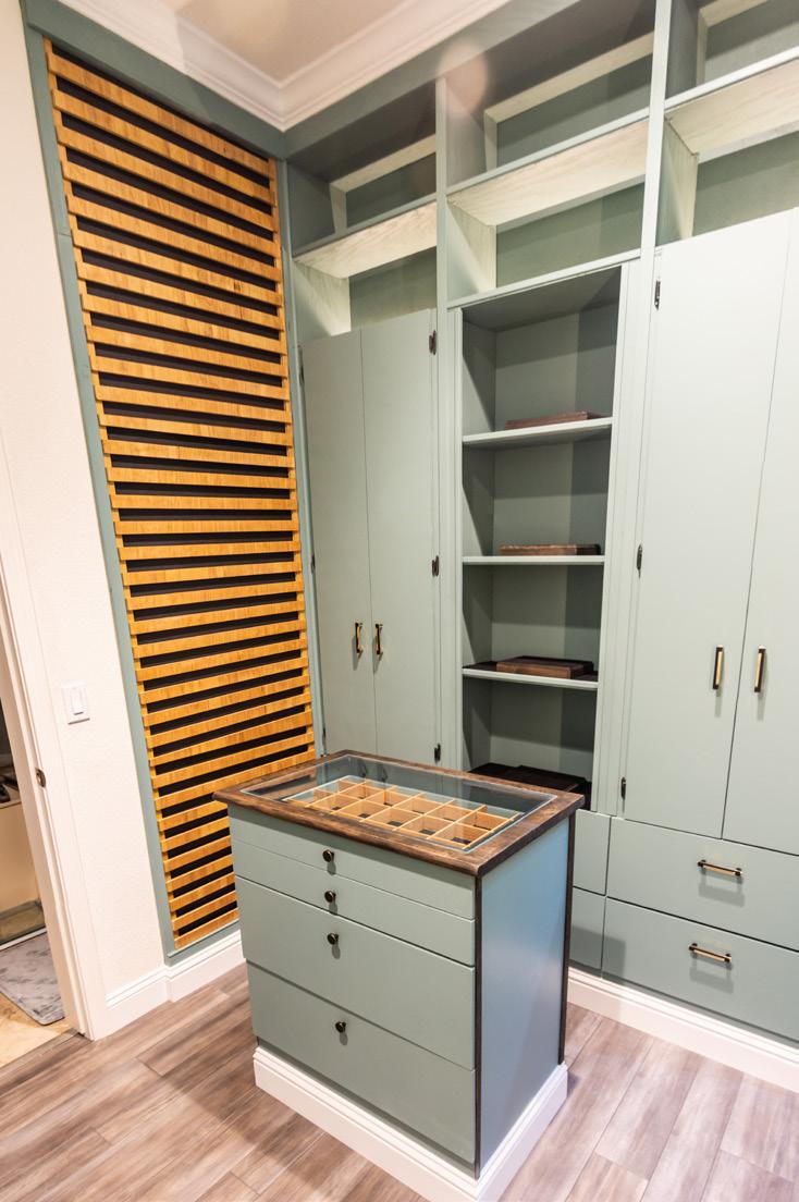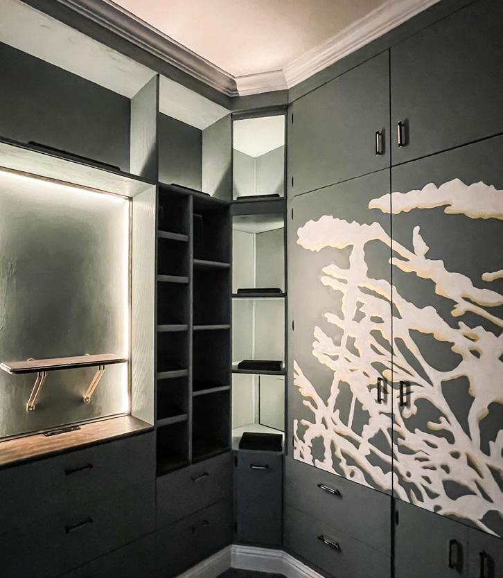 Designed to display bags and other collection items, this fully customized walk-in-closet features a center island to display watches, plenty of storage for clothes and shoes, lighting and a custom artwork inspired of wild grasses moving in the wind