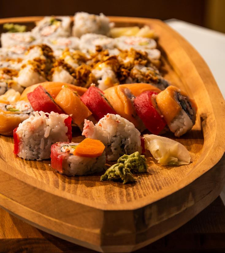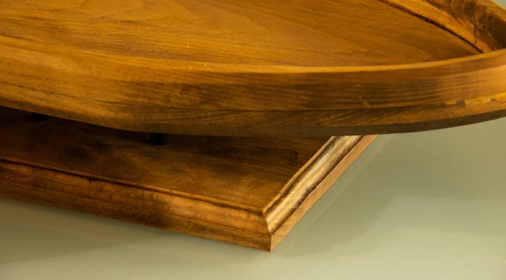 The furniture is made of two drawers at the bottom, a main space able to fit a 65 inches television, and shelves at the top, also featuring a wood carved centerpiece. To complement the centerpiece and bring some subtle light, some recessed LEDs are place above the shelves.