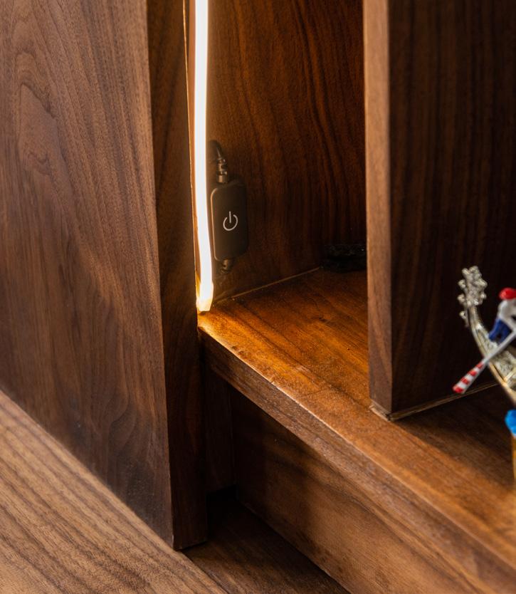 As the centerpiece of the main space for a Californian home, these cubicles made out of beautiful walnut wood are here to exhibit souvenirs and trophies from travels all around the world. The walnut tainted with natural oil is here to complement the darker tones of the flooring, and stand as a unique centerpiece for the space.