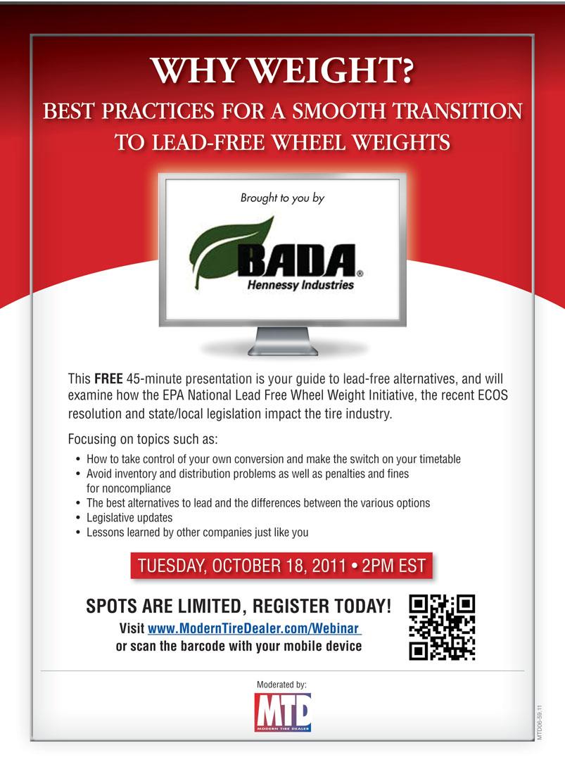 “Th e Environmental Council of States sent a resolution to the EPA acknowledging their research and encouraging them to phase out the use of lead weights nationally by 2013,” says Kevin Keefe, vice president of marketing for Hennessy Industries, supplier of Bada steel wheel weights. “We’ve been engaged with the EPA for the bett er part of almost seven years on this subject.”