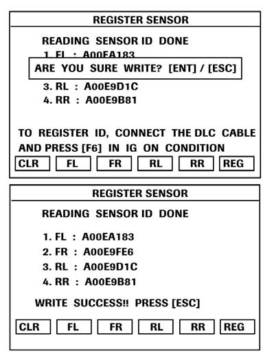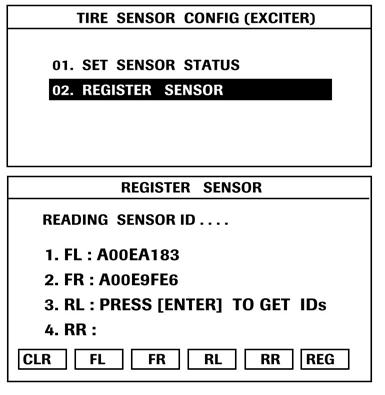 1. Holding the TPMS exciter scan tool within three inches of the sensor valve, read each tire pressure sensor ID in the following order: front-left , front-right, rear-left , rear-right. 2. Connect the TPMS exciter to the Data Link Connector located under the left side of the instrument panel. Register the four sensor IDs to the receiver. See Figures 2 and 3. 3. Disconnect the TPMS exciter from the diagnostic link. Cycle the ignition and wait four minutes. Ensure that “NORMAL RECEIVER STATE” is displayed. ■