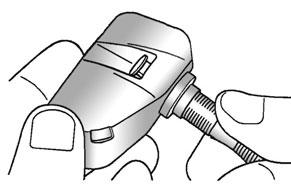 1. Remove the wheel and tire assembly. CAUTION: Avoid tire/tool contact with the valve while demounting the tire. 2. Defl ate the tire and remove the balance weights. Th e bead should be broken about 180 degrees from the valve side of the wheel. Th e bead breaker should not be set too deep. Demount should end near the valve. CAUTION: Th e valve nut should not be re-used. 3. While handling the sensor with care, remove the valve nut. 4. Discard the valve immediately. 5. Assemble the valve to the sensor, and turn the valve three times with the square part of the screw in the slot. See
