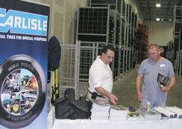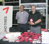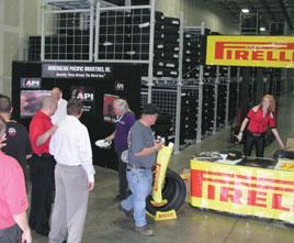 1. Marc Voskeritchian, left, north central regional sales manager for Carlisle Transportation Products, gives information about the company’s specialty tires to Bill Davenport, owner of Bill’s On Broadway Auto Repair & Service in Grove City, Ohio. 2. Ali Cardenas, area dealer manager for Continental Tire the Americas, shows off the company’s Continental ExtremeContact DWS UHP tire, in size 315/35ZR20. 3. Brian Barrows, right, regional sales manager for Kumho Tire U.S.A., is joined by Kauffman Tire’s Nelson Waynesboro, vice president of wholesale operations, at the Kumho booth. 4. Plenty of customers came by for swag from the booths, including signed Pirelli posters by model Namiah Covell (far right). 5. Harry Kauffman (left, negotiating with a Goodyear sales rep) founded the company in Wooster, Ohio, in 1936. Seventy-fi ve years later, his son, John, is CEO, while John’s son, Mark, is president. 6. From left to right: Luis Carbonell, district manager, consumer sales; Karen Zaro, account manager; and Ed McMahon, customer development manager, man the Goodyear booth.