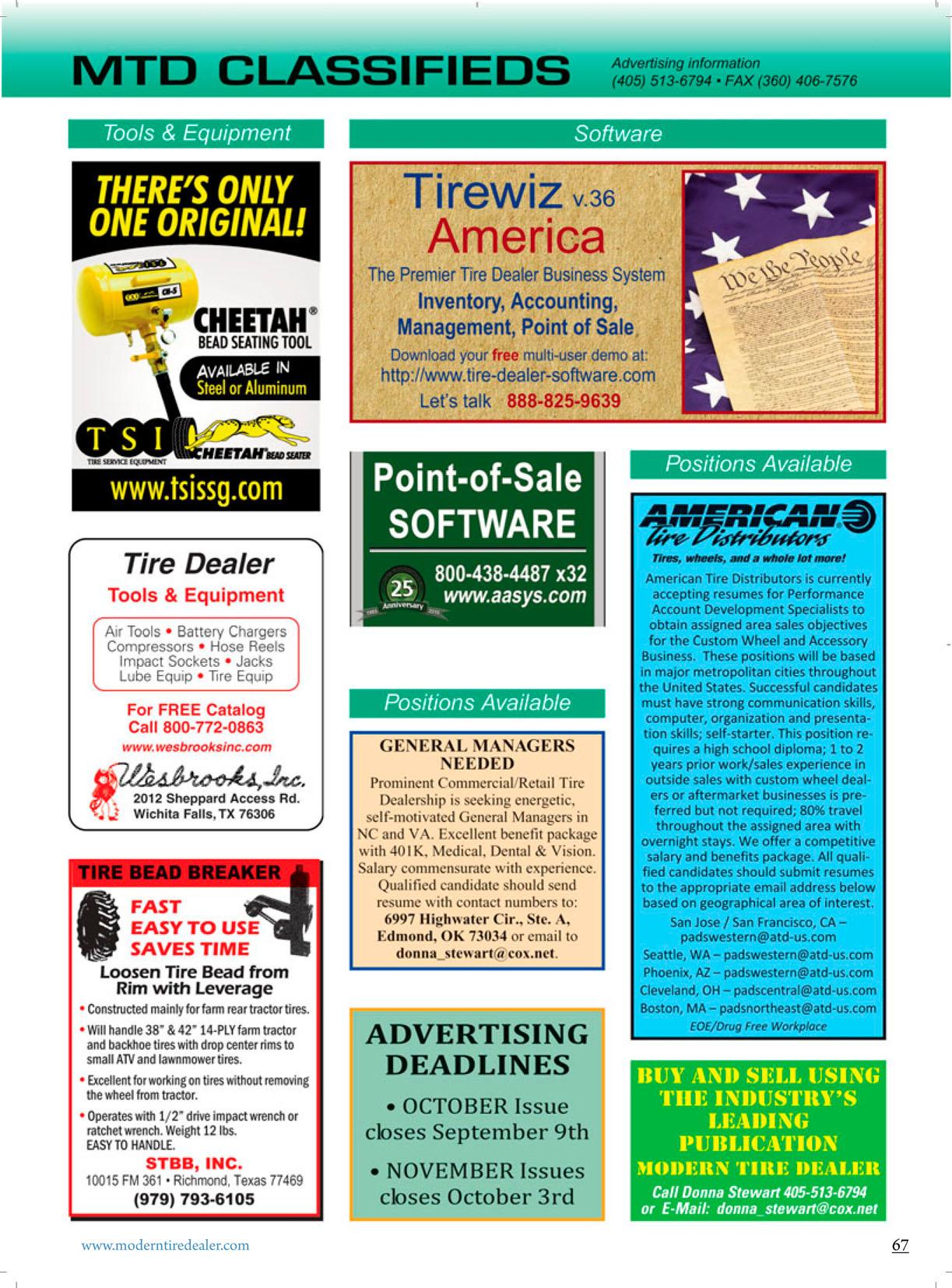 Every study ever done says that a buyer is influenced by sellers who have good att itudes, smile, show empathy, and off er great service because they really care. Th ere are a lot of things you can’t control, but the one standard in your company you can control is that “we will get the best out of ourselves!” 2. Leverage skills. You’re the seller, and customers and prospects are the buyers. You have products and services, and they have needs and money. Trade the two with skill. Some of the training keys I do in-house with clients are to role-play objections/answers at the counter to close sales instead of losing them, write scripts of what to say, practice asking key questions and listening, use the phone eff ectively to get buyers Doug Trenary, author of “The SalesMind,” has taught a number of independent tire sets. Here are three examples.