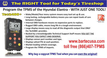 SUBJECT VEHICLE: 2008-10 Hyundai Elantra. SENSOR IN TIRE? No, sensors are mounted in the wheels. SPECIAL TOOLS NEEDED? Yes, a TPMS exciter scan tool.