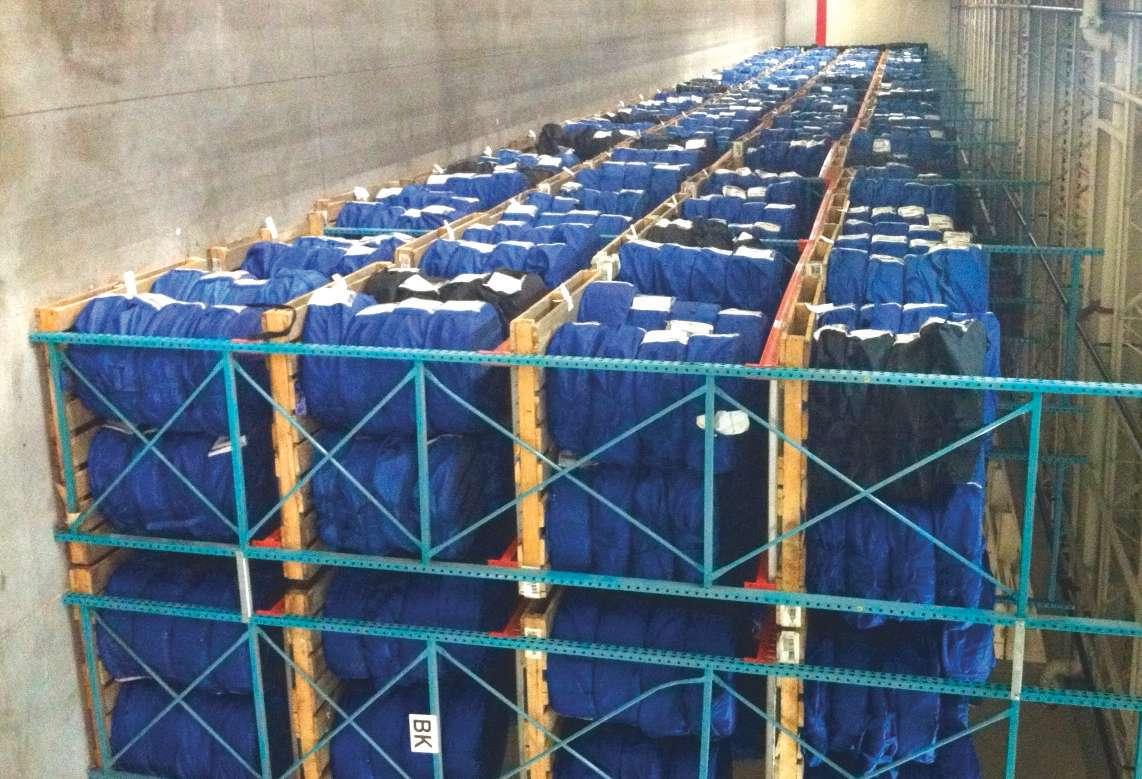 Belle Tire stores off-season tires in “Tire Valet” bags in a 306,000-square-foot distribution center. Identif cation tags that show the tire’s owner and the bar codes used to track the tires in Belle Tire’s climate-controlled distribution center are attached to each bag. Customers pay $80 for four tires per season.