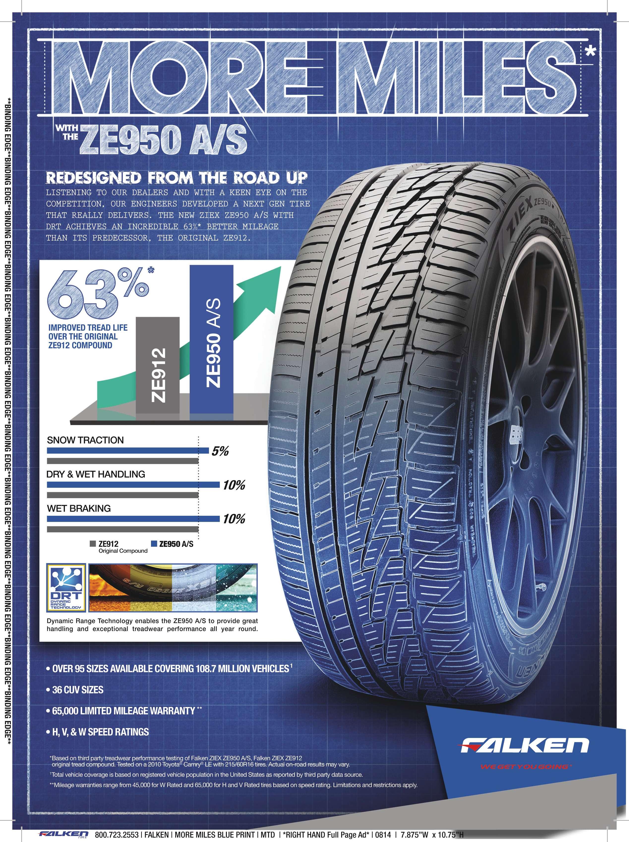 • tougher sidewalls through the use of CoreGard technology, a thicker, extended shoulder and computer modeling to predict object paths and create a sidewall design most likely to defect protruding objects; • longer treadlife through optimally blended tread rubber to reduce chips and tears on gravel, a new footprint shape and interlocking tread design to provide more uniform wear and stone ejectors that reduce drilling into the tire by pushing objects out of the tread; and • aggressive traction through side biter lugs in the sidewall that improve traction in mud, snow and rocks, raised bars in the shoulder to help release compacted mud for beter traction in sof soil and 3-D sipes that create biting edges for beter traction in snow. ■