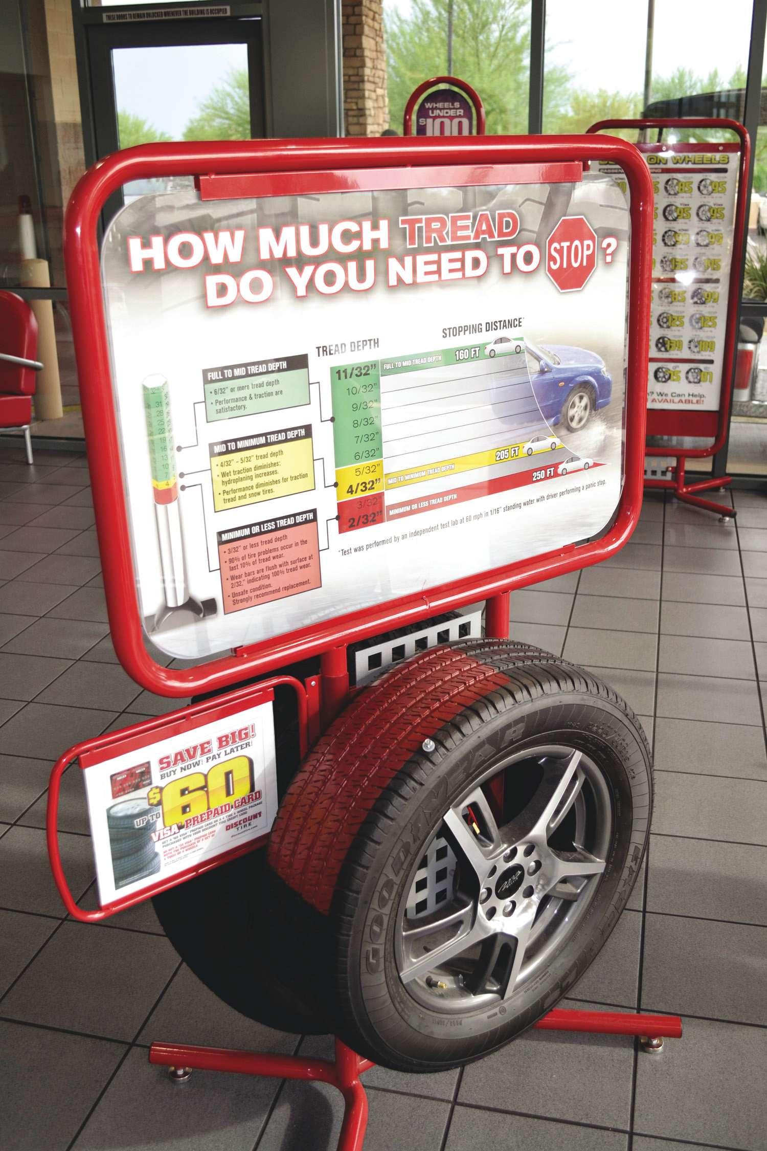 A showroom display asks drivers to think about tread depth. Discount Tire considers 3/32-inch or less to be “unsafe.” Store managers and assistant managers strongly recommend replacing the tires at that point.