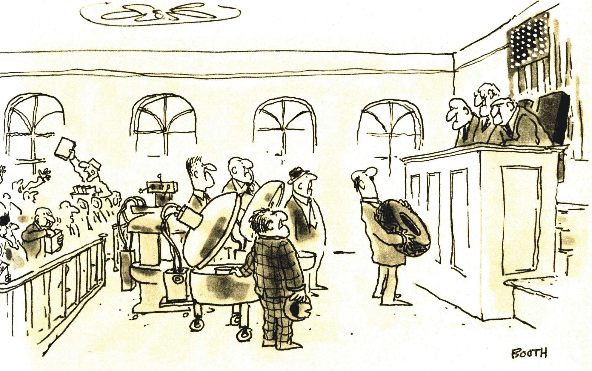 George Booth gained fame illustrating the covers of The New Yorker magazine. His cartoons often feature befuddled men, crazed cats and fat dogs.