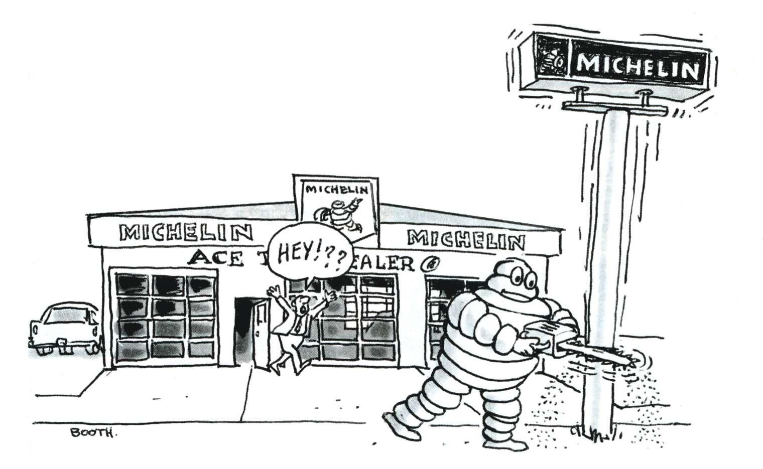 In early 1978, dealers sued Michelin claiming federal anti-trust violations when the tire maker canceled contracts with them. Dealers sought millions in damages citing violations of the Sherman Act, the Clayton Act and franchising statutes. The tire dealers claimed they had invested millions in the promotion and establishment of goodwill toward Michelin and its tires. Dealers felt Michelin was “trying to eliminate the middle man with the establishment of more company stores.” At the time, Michelin did not comment on the lawsuits. Differences must have been ironed out, as a check on the dealerships involved (which are still in business) show them selling Michelin tires today.