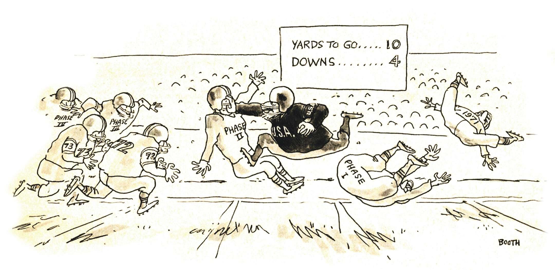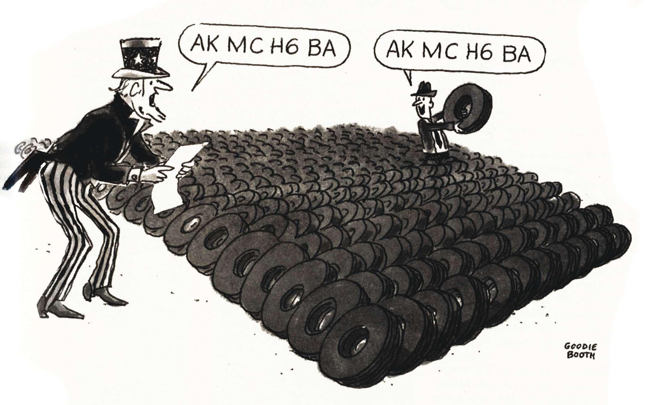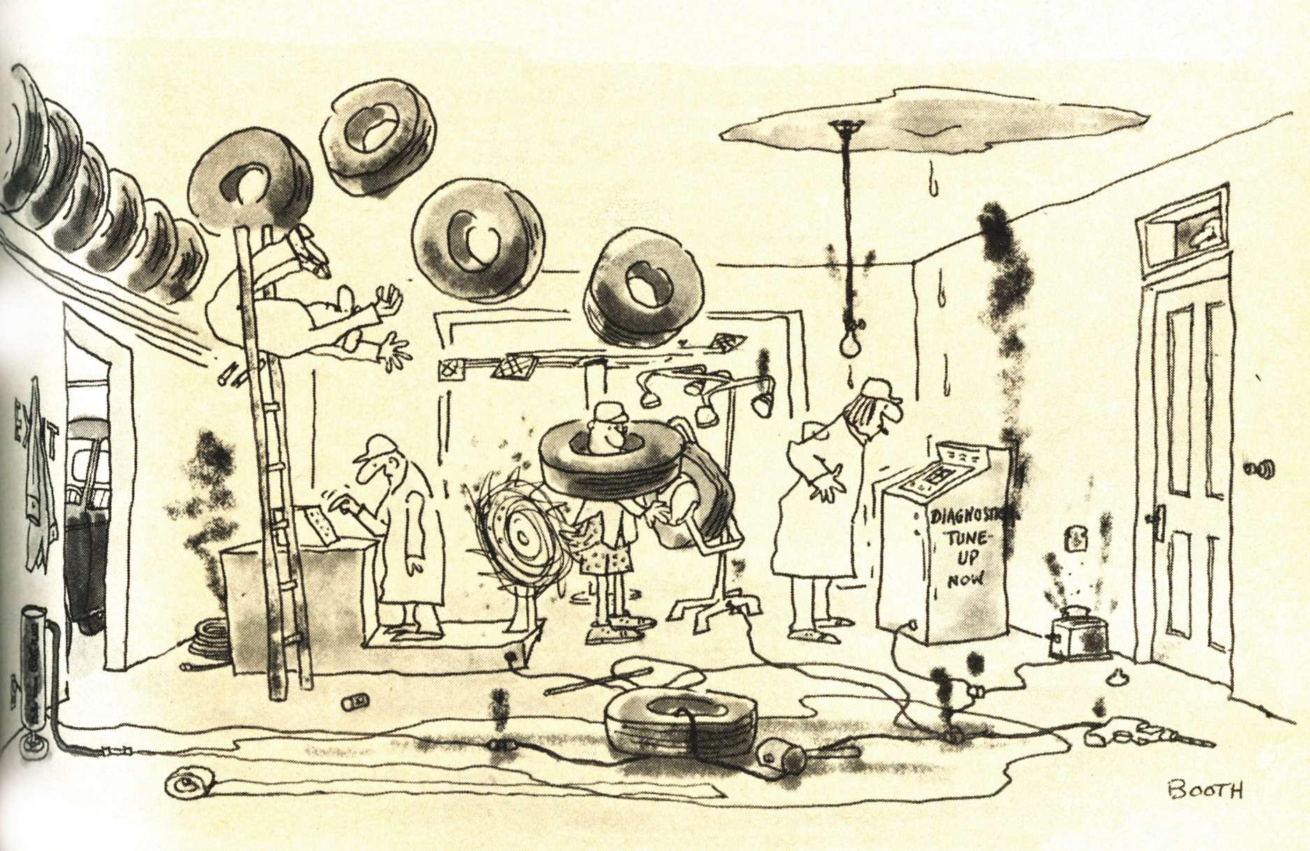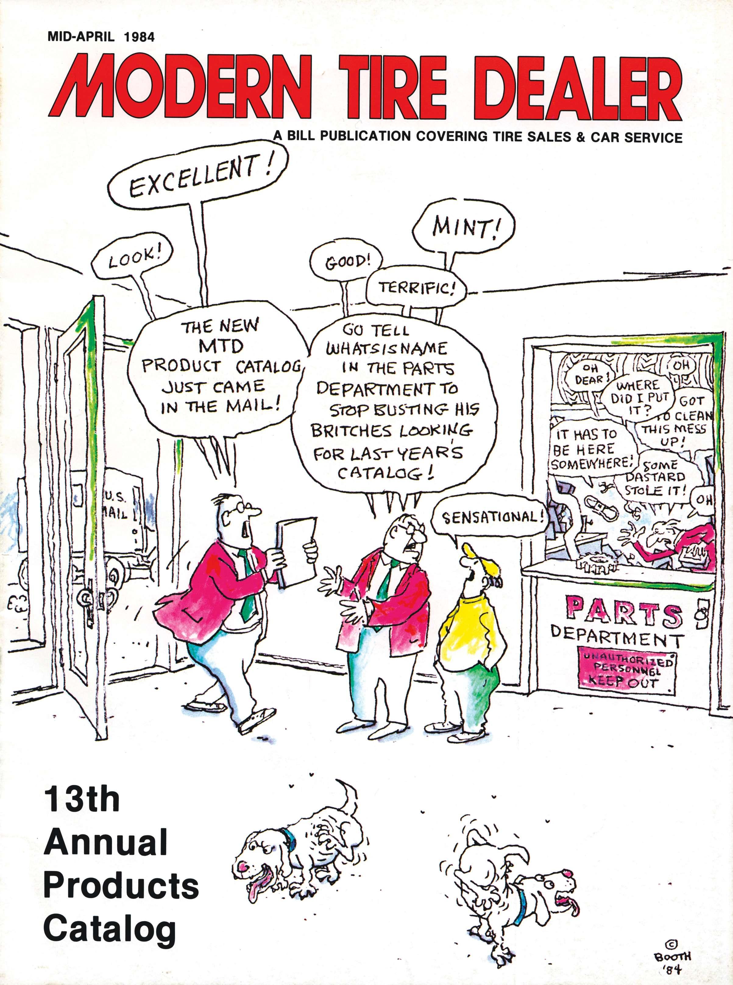 Although Booth’s frst cartoon appeared in our magazine the month he was hired by our company, April 1959, his frst cover illustration was in June 1959 when the publication changed its name from Tires TBA Merchandising to Modern Tire Dealer (the magazine for the TBA dealer and retreader). MTD was being produced on Third Avenue in New York City at the time, later moving to what was referred to as the “Rubber Capital of the World,” Akron, Ohio.