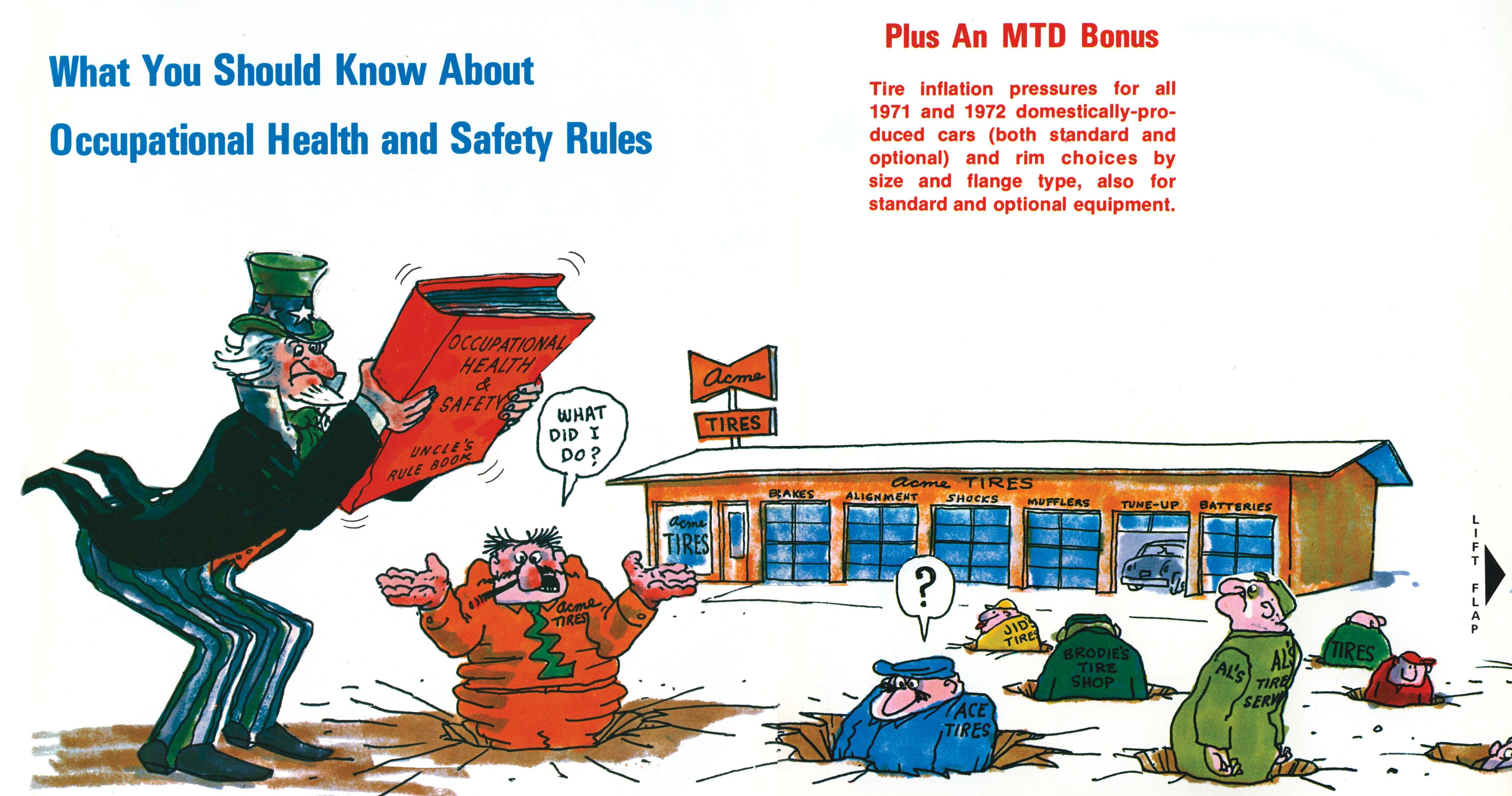 Regulations issued by the Labor Department’s Occupational Safety and Health Administration (OSHA) called the Williams-Steiger Occupational Safety and Health Act of 1970 took effect in April 1971. The National Tire Dealers and Retreaders Association (NTDRA), which later became the Tire Industry Association (TIA), put together a guide and held seminars to help dealers comply and prevent fnes or a business shutdown. The NTDRA urged dealers to become thoroughly acquainted with the act and resulting regulations of OSHA, establish a program of safety and health practices for their business, make sure that corrective action was taken to assure employees follow job safety rules, and conduct periodic safety inspections on their own. Regulations covered such things as the proper use of tire safety cages, having adequate fre extinguishers, proper electrical wiring, logging injuries on the correct OSHA form and properly marked exits. “OSHA regulations are not guidelines or recommended practices, they are the law,” Kevin Rohlwing, TIA’s senior vice president of training, wrote in our October 2015 issue in the article “Guilty until proven innocent.”