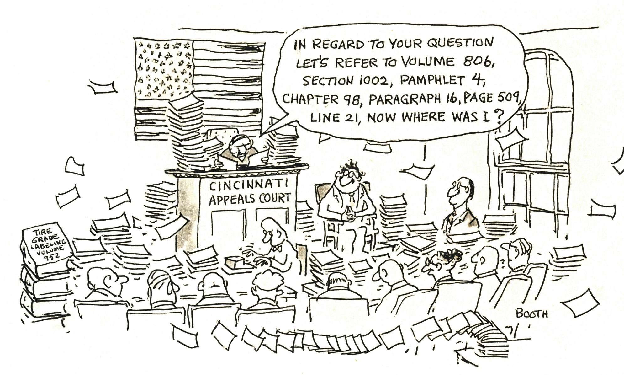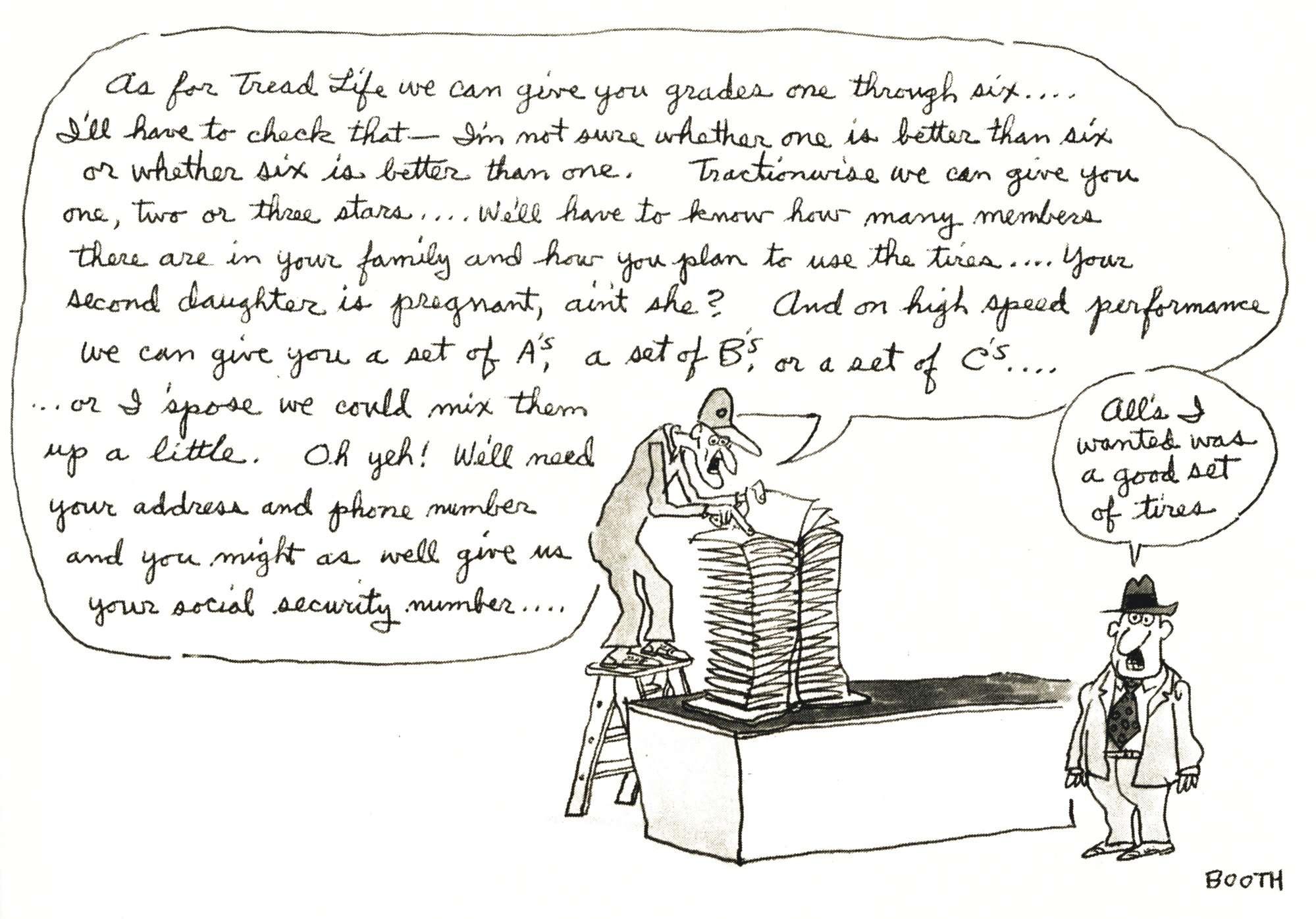 Dogs,” “Tink Good Toughts about a Pussycat” and “Omnibooth: Te Best of George Booth.”) His freelance work for Modern Tire Dealer continued over the years and included covers and inside art to illustrate the important topics of the day such as tire labeling, tire grading, tire registration, Occupational Safety and Health Administration regulations and so on. “I loved working for MTD,” Booth told us. “It is a terrifc company, and I was grateful for the experience.” You will see some of his earlier cartoons reprinted on the following pages and to throughout the issue. thr