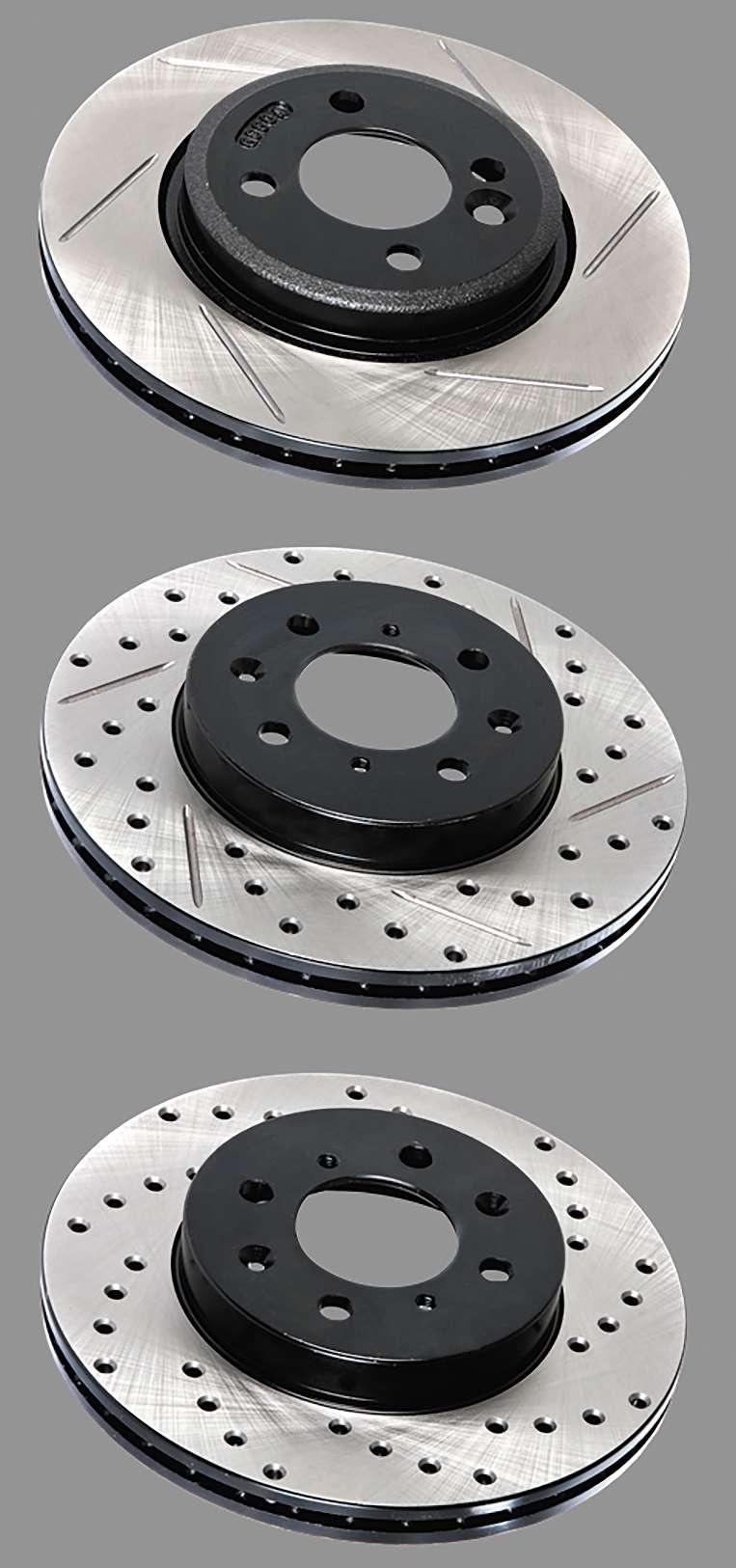 Aftermarket performance rotors are offered in a variety of designs. Examples shown here (from top to bottom) include slots, slots and cross-drilled holes and cross-drilled holes only. Note that non-friction surfaces are e-coated to prevent rust and to maintain a like-new appearance.