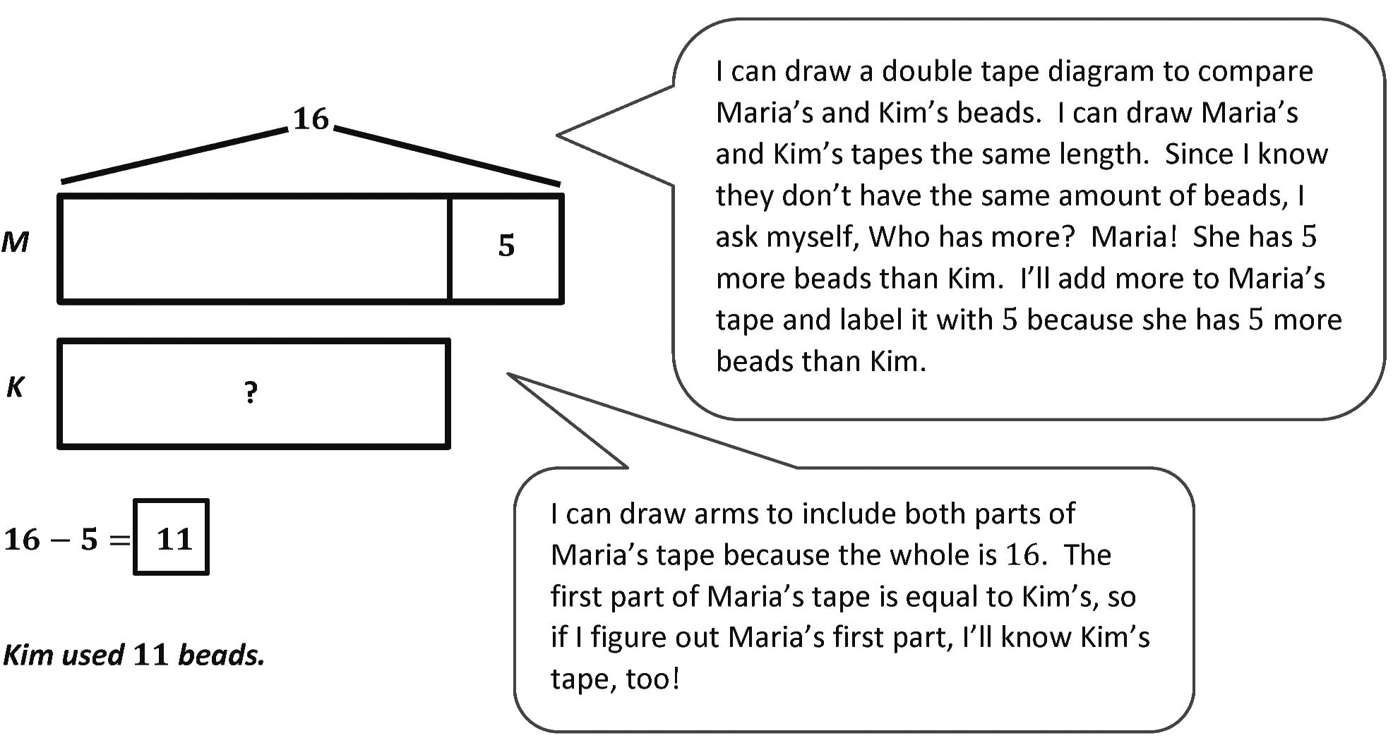 1. Maria used 16 beads to make a bracelet. Maria used 5 more beads than Kim. How many beads did Kim use to make her bracelet?