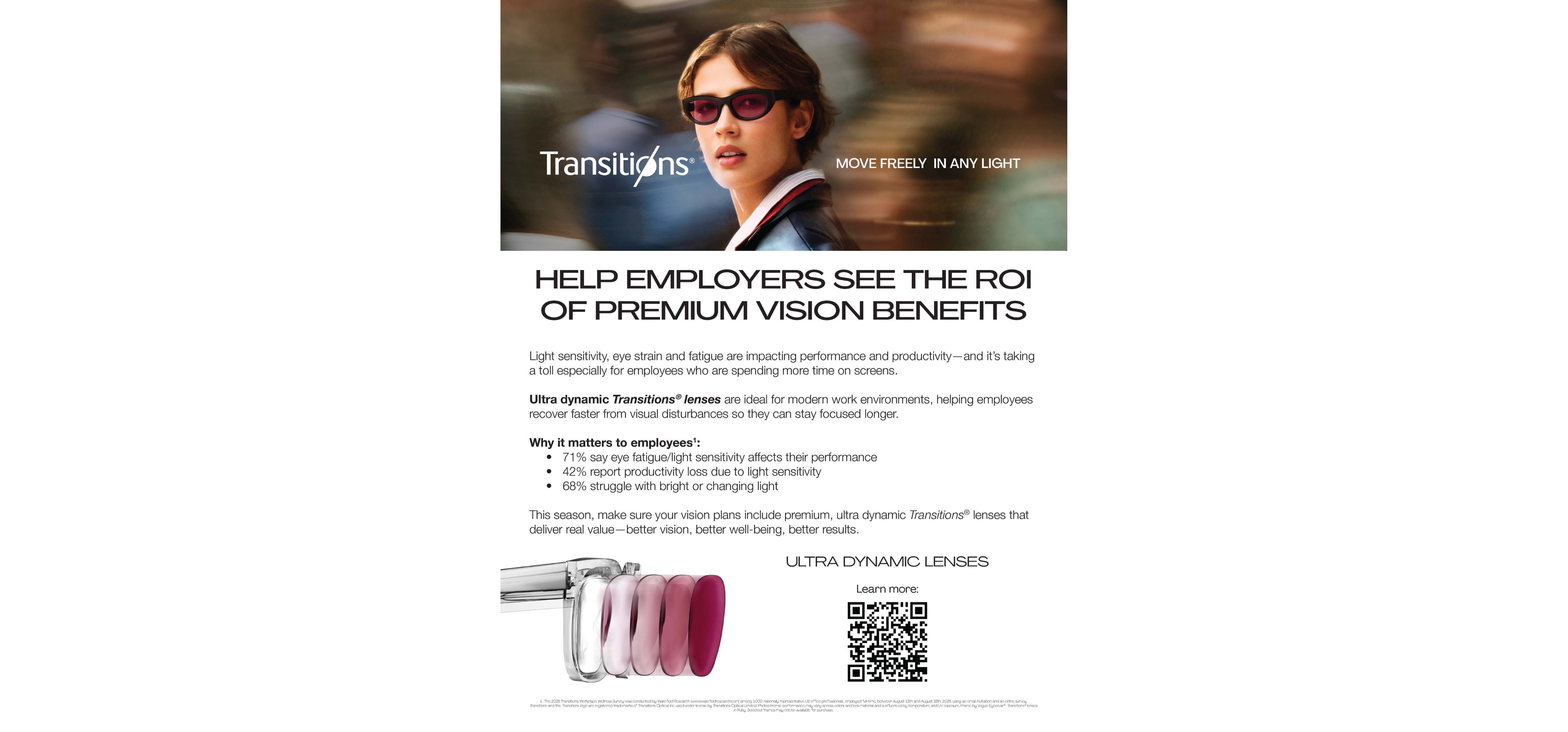 Leverage interactive tools and digital engagement. Tools like the Transitions Light Quiz and Virtual Try-On make it easy for employees to visualize lens options and understand their value. Cost calculators can also help demonstrate savings and encourage enrollment.