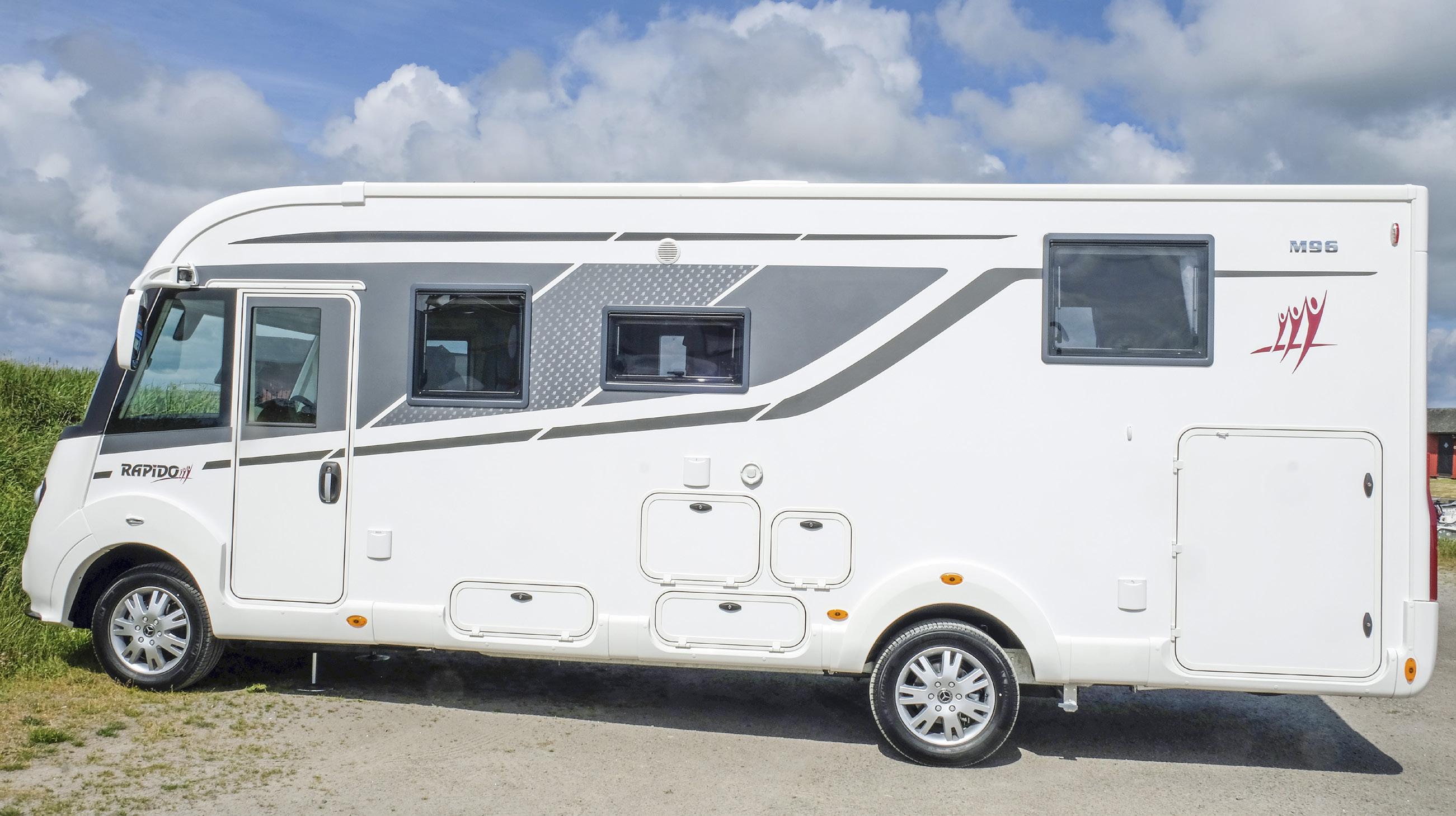 Märke Rapido Modell M96 Planlösning Öppen planlösning, face-to-face-soffor, queenbed bak Chassi Mercedes AL-KO Motor 2,2 l 143 hk/178 hk (tillval) L/B/H 7,54/2,35/2,95 meter Totalvikt 3 175 kg/4 500 kg (tillval) Lastvikt 1300 kg, minus utrustning vid 4 500 kg. Värmesystem Truma Combi 6 CP Plus &INET/Alde INET ( tillval) Färskvatten 130/20 l Gråvatten 110 l Drivmedel Diesel Bränsletank 92 l Bältesplatser 2+2 Sovplatser 2+2/2+1 (tillval utan säng i hytten) Sängmått Queenbed (850 x 2100 cm) Grundpris 1 239 000 kr Utrustning levererad bil i urval. AC i bodelen, EP-hydrauliska stödben med våg, dragkrok, distronic farthållare, ACC, regnsensor, ljudpaket, borttagning av hyttsäng, TV-antenn, solpanel, 32” TV, 17” alu-fälgar, ALDE, golvvärme, dubbla AGM-batterier, automat, 178 hk. Pris ca 1 600 000 kr
