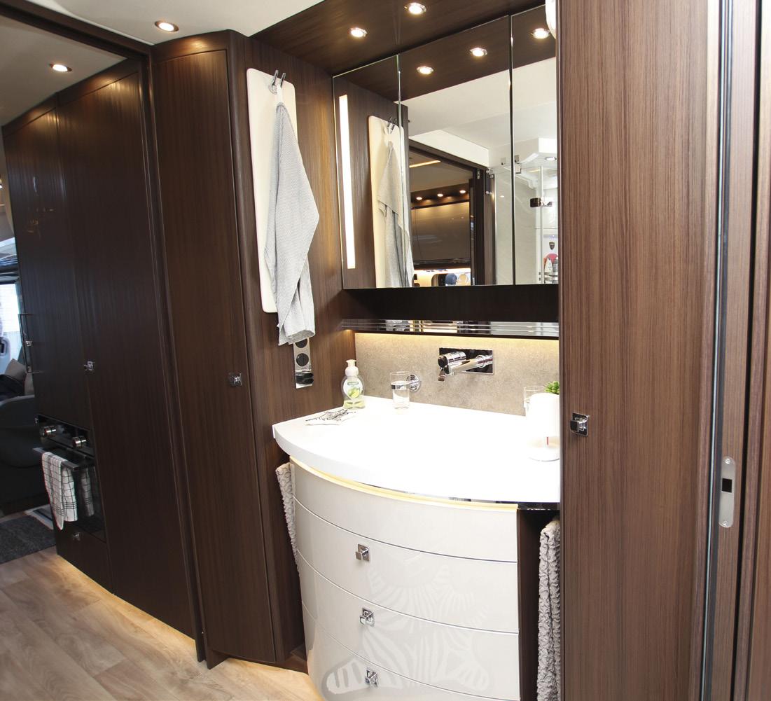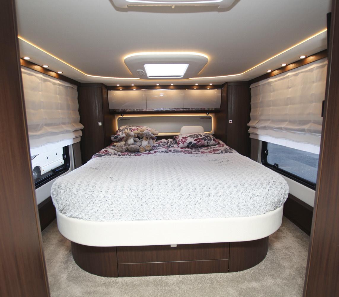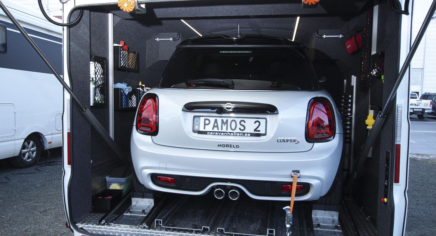 För den som är beredd att lämna sin komfortzon är det lätt att förstå varför. Morelo Empire Liner är trots allt en 11,5 meter lång premiumbetonad bostad med bilgarage som rymmer en Mini Cooper. Det är parets tredje Morelo och den är på väg att bytas ut mot den helt nya Morelo Grand Empire, byggd på Mercedes Actros lastbilschassi. En klass högre än Empire Liner, som baseras på Mercedes Atego-chassi. - Atego är en distributionsbil som i huvudsak rullar i städerna. Actros är en fjärrtrafikbil, med högre komfort. Jag ser verkligen fram mot att köra den, säger Patrik.