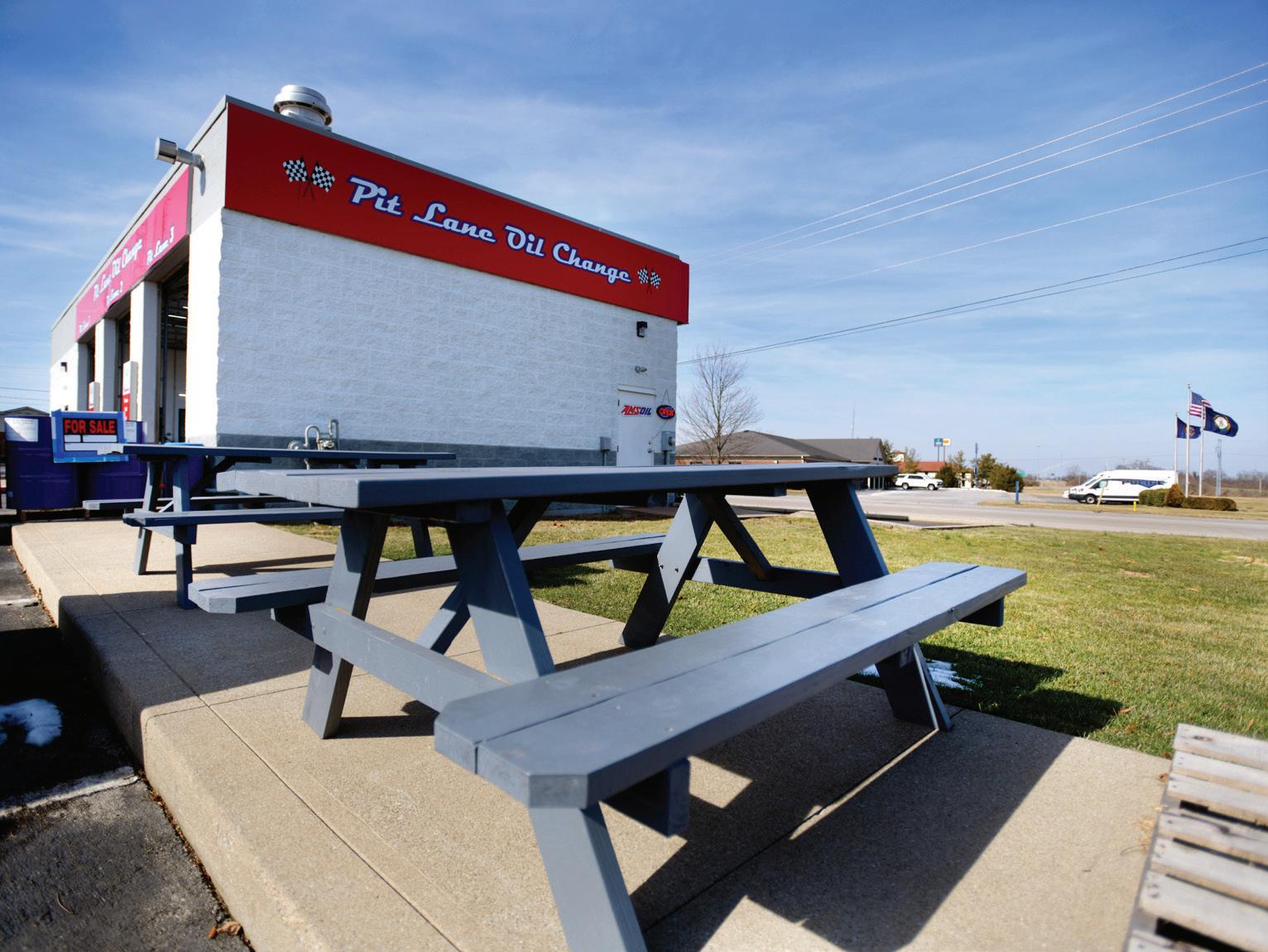 Customers will often drop off their car for an oil change during their lunch break at work and will sit outside at one of the several picnic tables provided by the shop and eat while they wait.