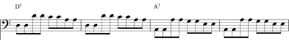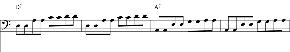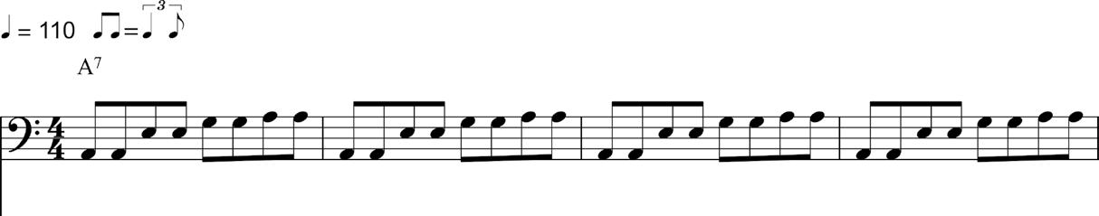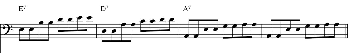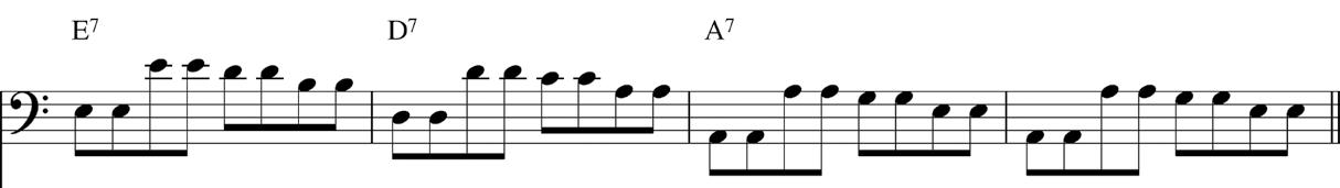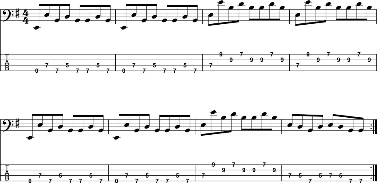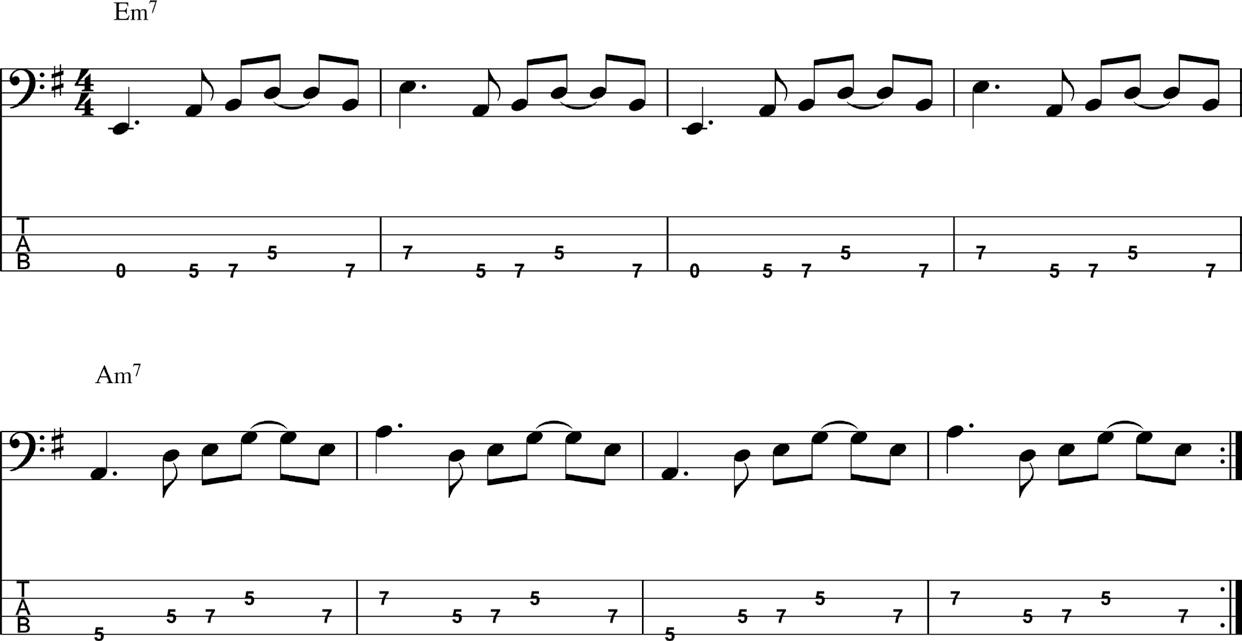 In Exercise 3, we’ll create another groove by adding the fourth scale degree to our blues box. Using the root, fourth, fifth, flat seventh, and octave, play the pattern twice over Em7—equalling a four-bar phrase— and twice over Am7. This may transport you to other familiar grooves, particularly those in the soul, R&B or pop/rock vein. Without doing too much rearranging, you’ll be able to play the bass-line to Sheryl Crow’s ‘All I Wanna Do’.
