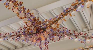 installation “represents the vast network of neurons connecting the youth and neighbors of the surrounding community,” said O’Donnell. Measuring over 121 ft.-long and 35 ft.-wide, the work interweaves 20,000 glass spheres. “The internal structure is comprised of a series of welded hubs, interconnected by sweeping arcs of rolled stainless tubing,” said Creative Machines design engineer Brandon Toland. “Intricately wrapped stainless steel ‘lace’ covers the entirety of the sculpture, holding thousands of individually hand-placed glass spheres. Each globe glows from the LED behind it.” Driving the network of LEDs is a sensor housed in a kiosk that responds to motion and color signals such as people waving their hands, or holding illustrations from children’s books, or the color of visitors’ clothing. There are hidden sensors placed throughout the library that also trigger special lighting sequences. Color Kinetics supplied the LEDs and other components. “The process of learning and forming mental connections is more easily accomplished in an environment that is beautiful, immersive, and enveloping,” said O’Donnell.•